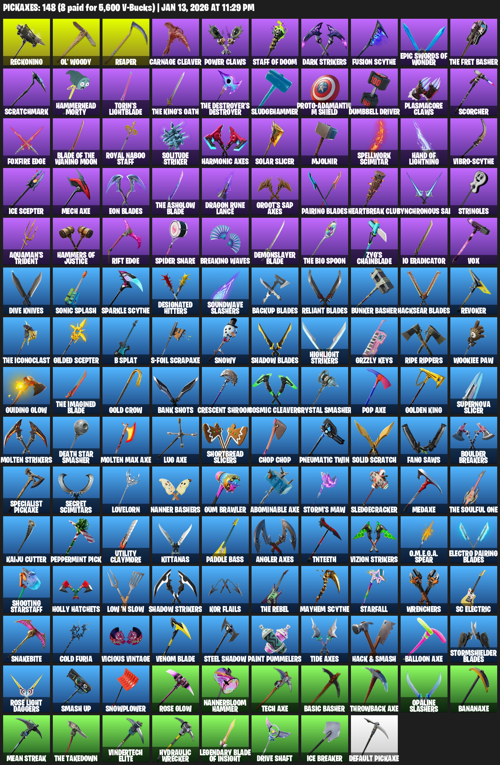 Reckoning, Ol’ Woody, Reaper, Carnage Cleaver, Power Claws, Staff of Doom, Dark Strikers, Fusion Scythe, Scratchmark, Hammerhead Morty, Torin’s Lightblade, Sludgehammer, Proto-Adamantium Shield, Dumbbell Driver, Scorcher