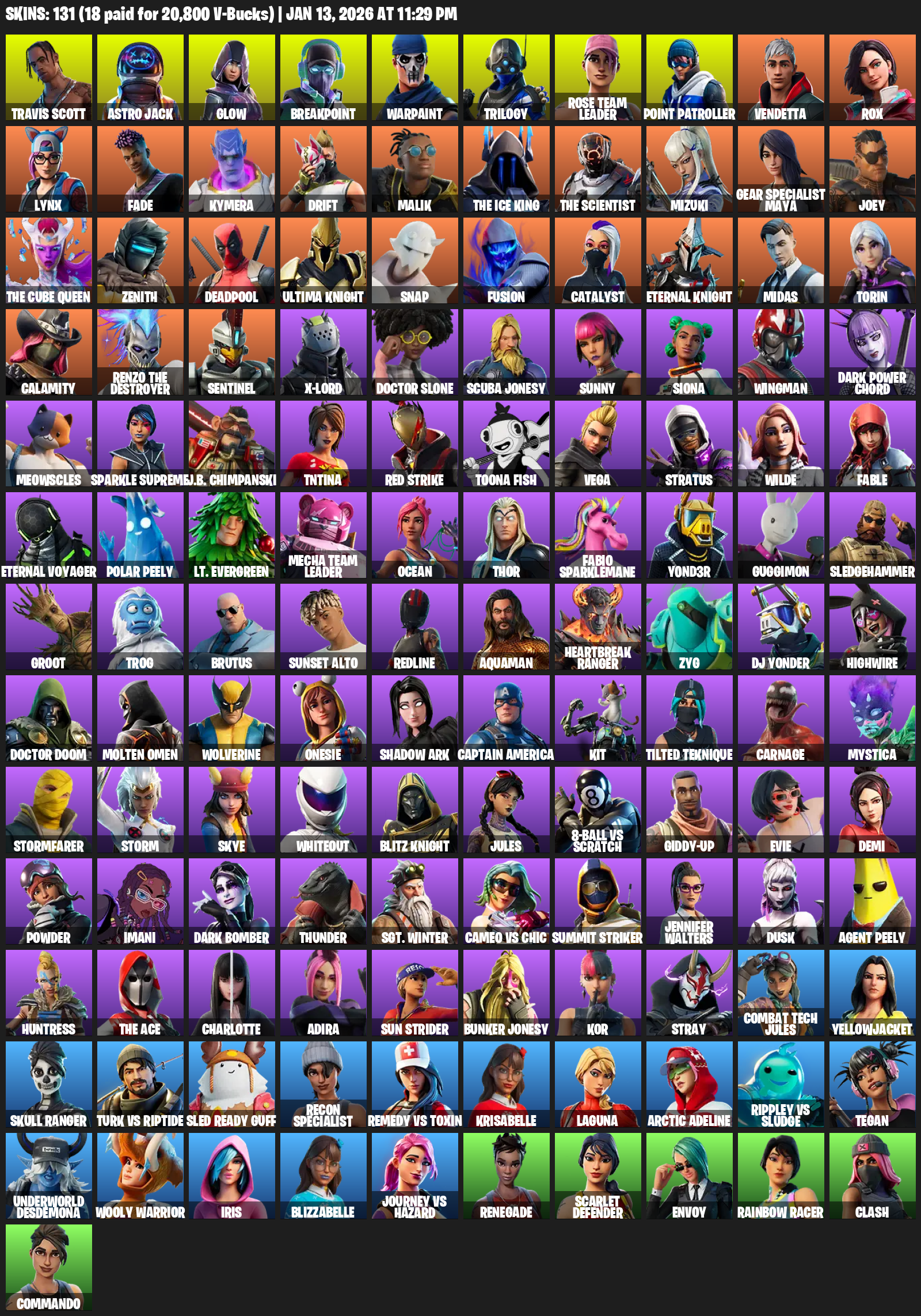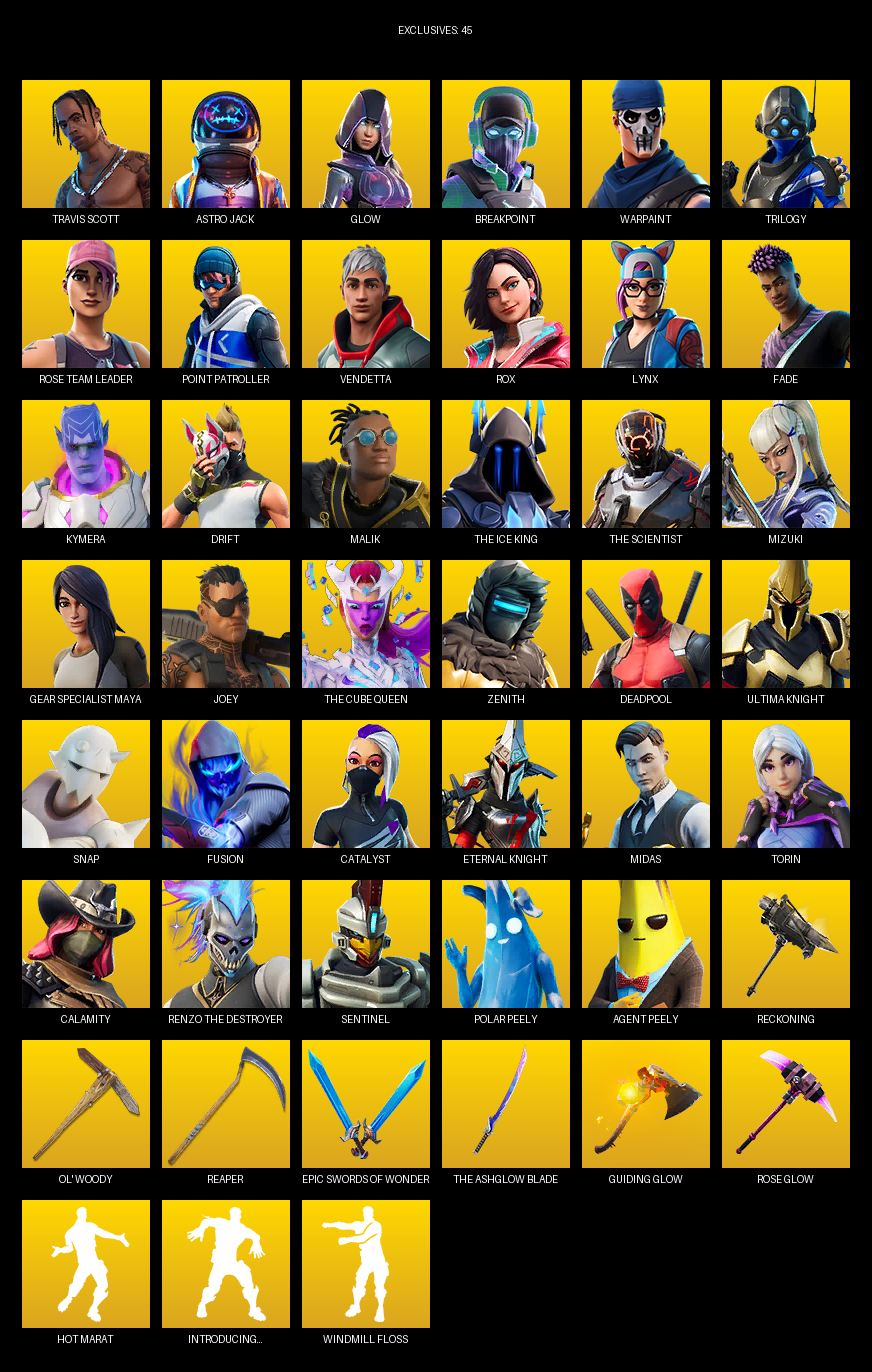 Travis Scott, Point Patroller, Gear Specialist Maya, Astro Jack, Glow, Breakpoint, Warpaint, Trilogy, Rose Team Leader, Vendetta, Rox, Lynx, Fade, Kymera, Drift, Malik, The Ice King, Mizuki, Joey