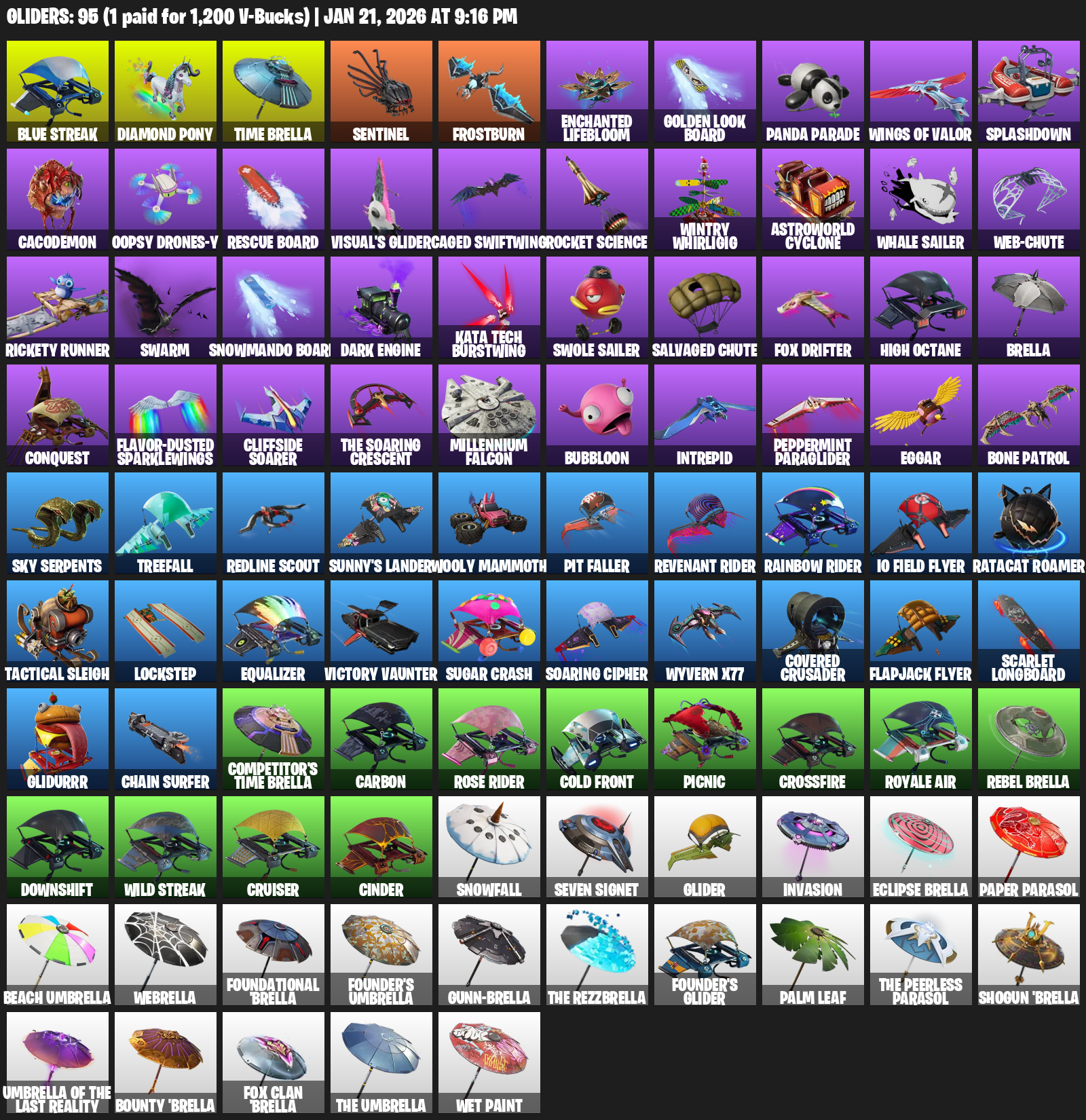 Diamond Pony, Time Brella, Sentinel, Frostburn, Enchanted Lifebloom, Golden Look Board, Panda Parade, Splashdown, Cacodemon, Oopsy Drones-y, Visual’s Glider, Caged Swiftwing, Rocket Science, Wintry Whirligig, Astroworld Cyclone, Whale Sailer