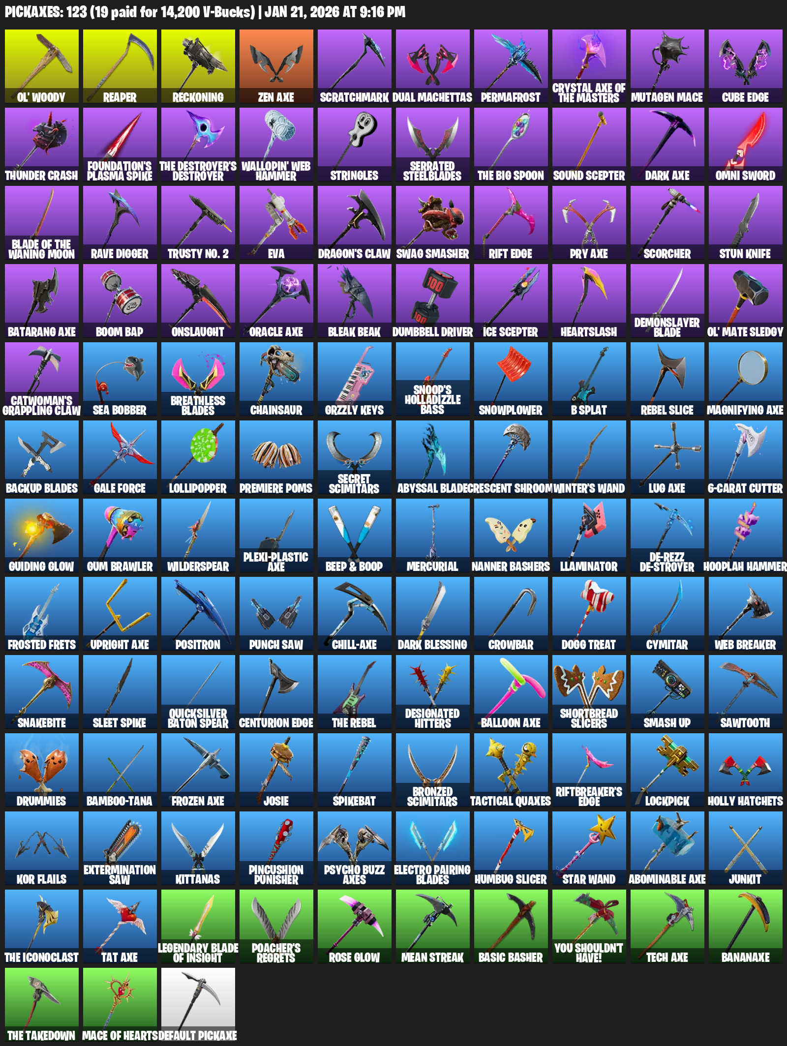 Ol’ Woody, Reckoning, Zen Axe, Scratchmark, Dual Machettas, Permafrost, Mutagen Mace, Cube Edge, Thunder Crash, Foundation’s Plasma Spike, Wallopin’ Web Hammer, Stringles, Serrated Steelblades, Sound Scepter, Omni Sword