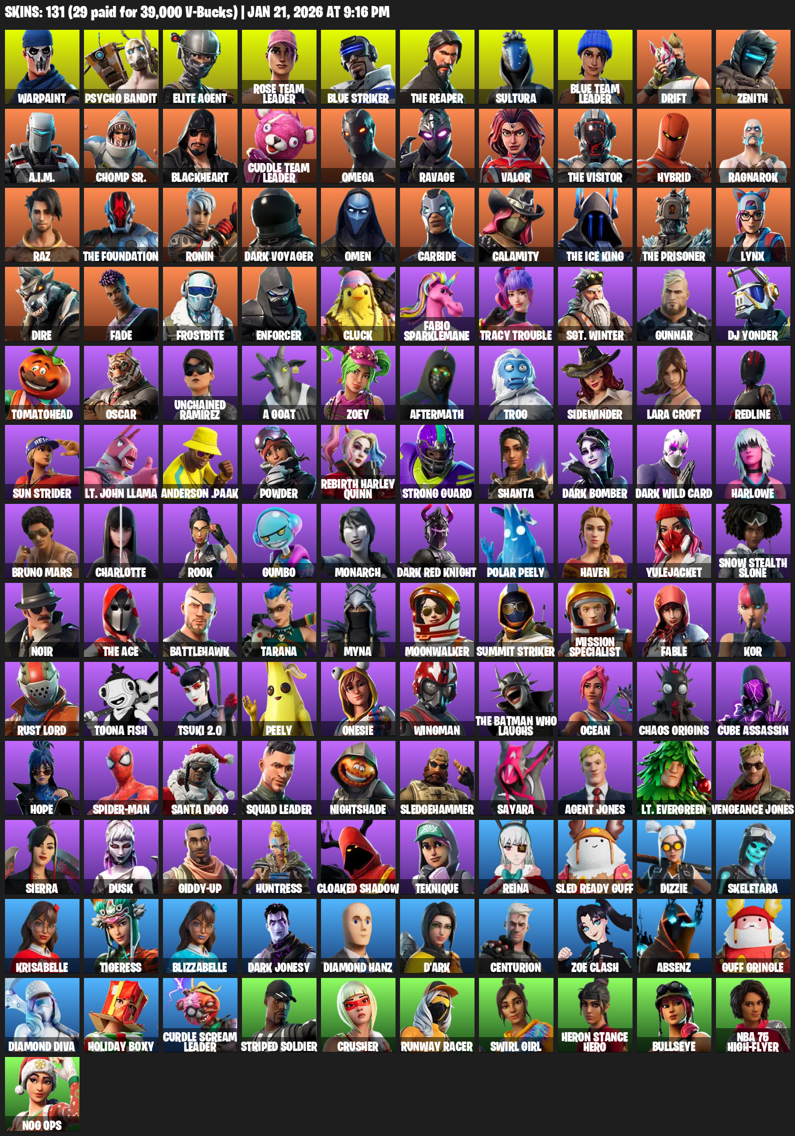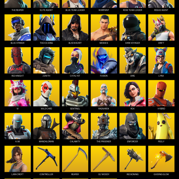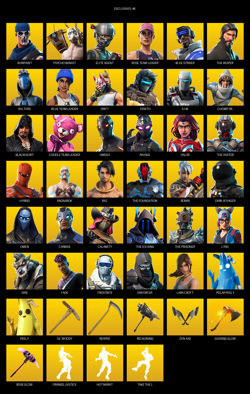 Elite Agent, The Reaper, Omega, Lara Croft, Warpaint, Psycho Bandit, Rose Team Leader, Blue Striker, Sultura, Drift, Zenith, A.I.M., Chomp Sr., Blackheart, Ravage, Valor, Hybrid