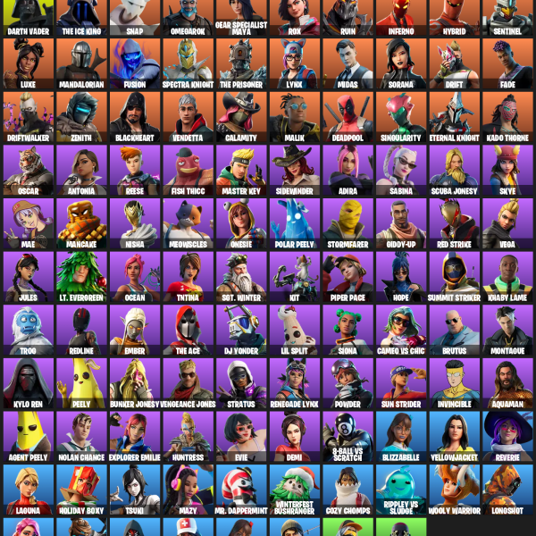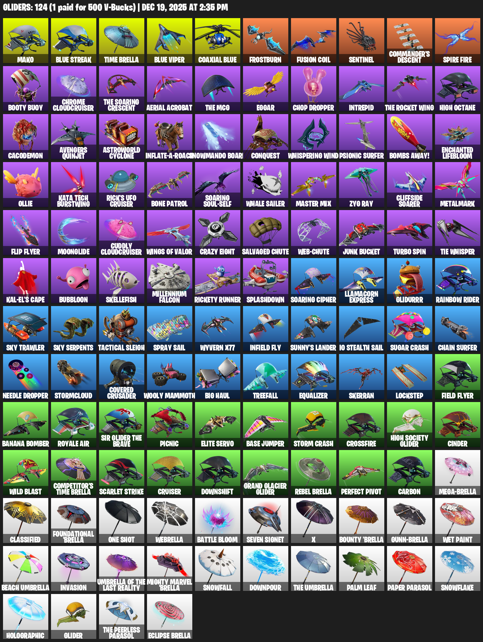 Mako, Time Brella, Frostburn, Sentinel, Commander’s Descent, Booty Buoy, Chrome Cloudcruiser, Aerial Acrobat, Eggar, Chop Dropper, Intrepid, High Octane