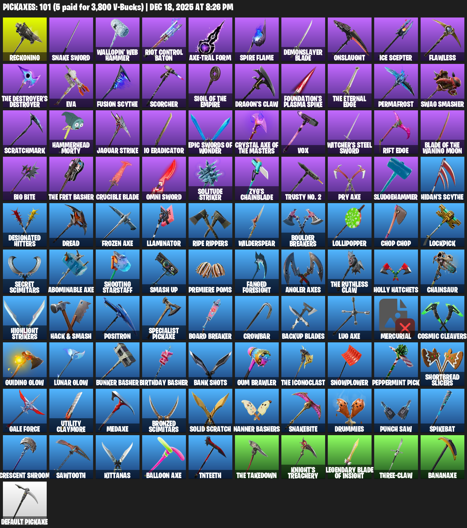 Reckoning, Snake Sword, Wallopin’ Web Hammer, Riot Control Baton, Axe-tral Form, Spire Flame, Demonslayer Blade, Onslaught, Ice Scepter, Flawless, EVA, Fusion Scythe, Scorcher, Dragon’s Claw, Foundation’s Plasma Spike, Permafrost, Swag Smasher
