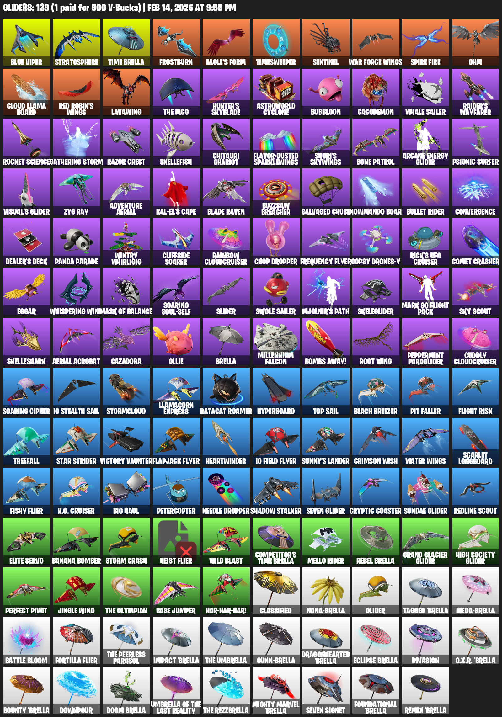 Blue Viper, Stratosphere, Time Brella, Frostburn, Eagle’s Form, Timesweeper, Sentinel, War Force Wings, Ohm, Cloud Llama Board, Lavawing, Astroworld Cyclone, Bubbloon, Cacodemon, Whale Sailer, Raider’s Wayfarer