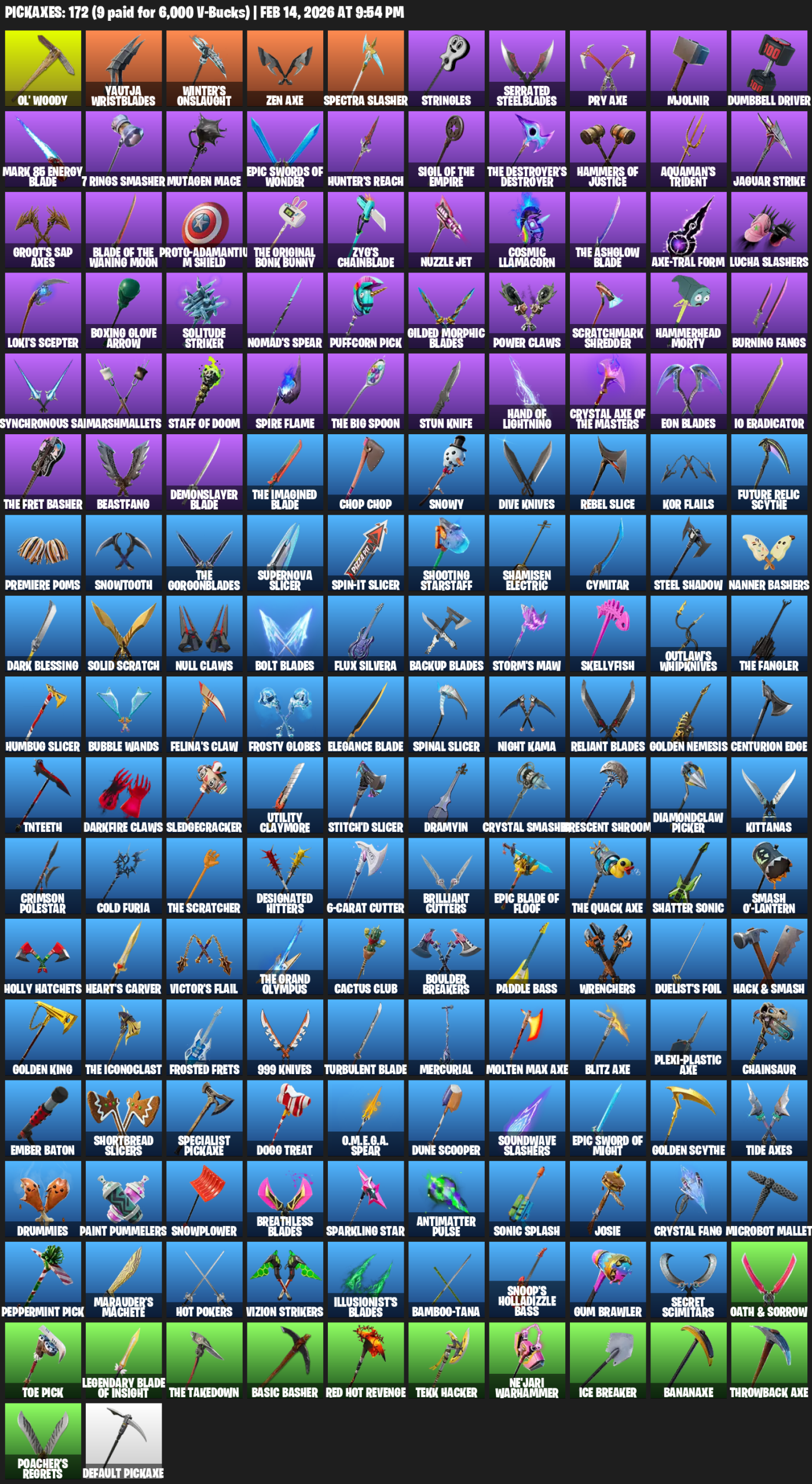 Ol’ Woody, Yautja Wristblades, Winter’s Onslaught, Zen Axe, Spectra Slasher, Stringles, Serrated Steelblades, Mjolnir, Dumbbell Driver, Mark 85 Energy Blade, 7 Rings Smasher, Mutagen Mace, Hunter’s Reach, Hammers of Justice, Aquaman’s Trident, Jaguar Strike