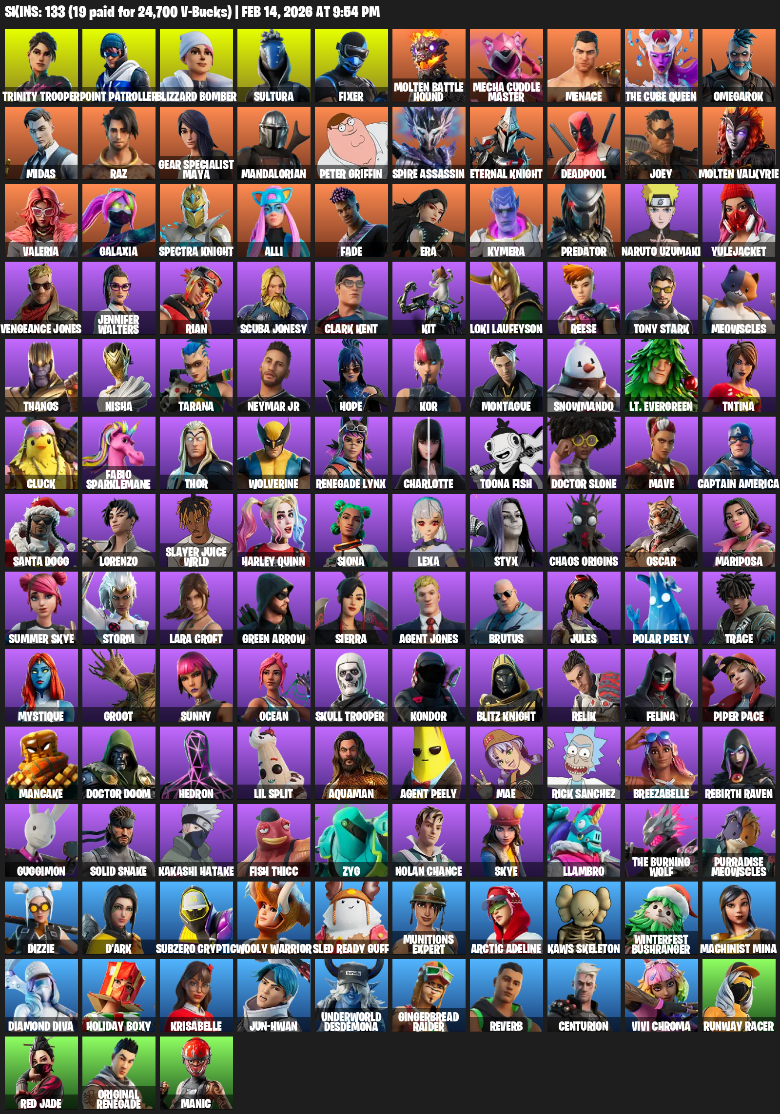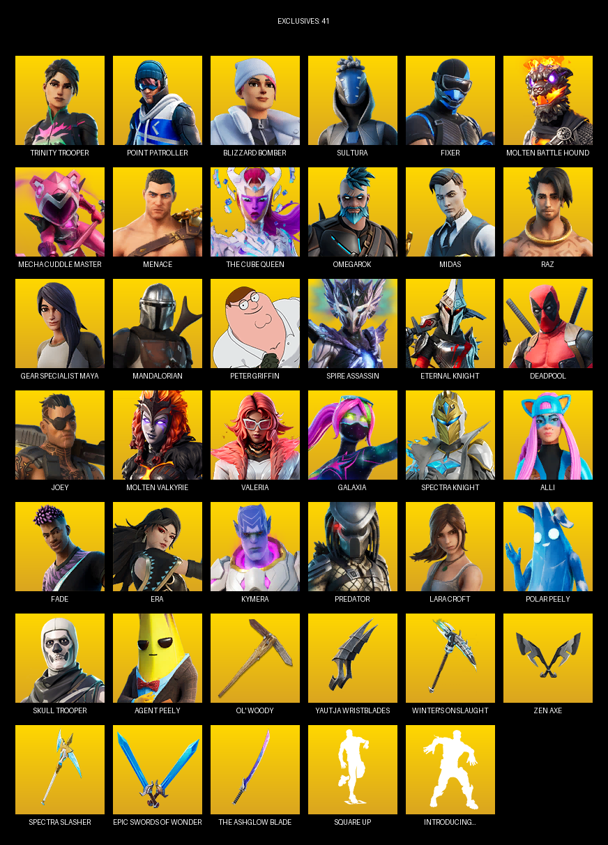 Point Patroller, Gear Specialist Maya, Lara Croft, Trinity Trooper, Blizzard Bomber, Sultura, Fixer, Molten Battle Hound, Mecha Cuddle Master, Menace, The Cube Queen, Omegarok, Midas, Raz, Mandalorian, Peter Griffin, Spire Assassin, Eternal Knight, Deadpool, Joey