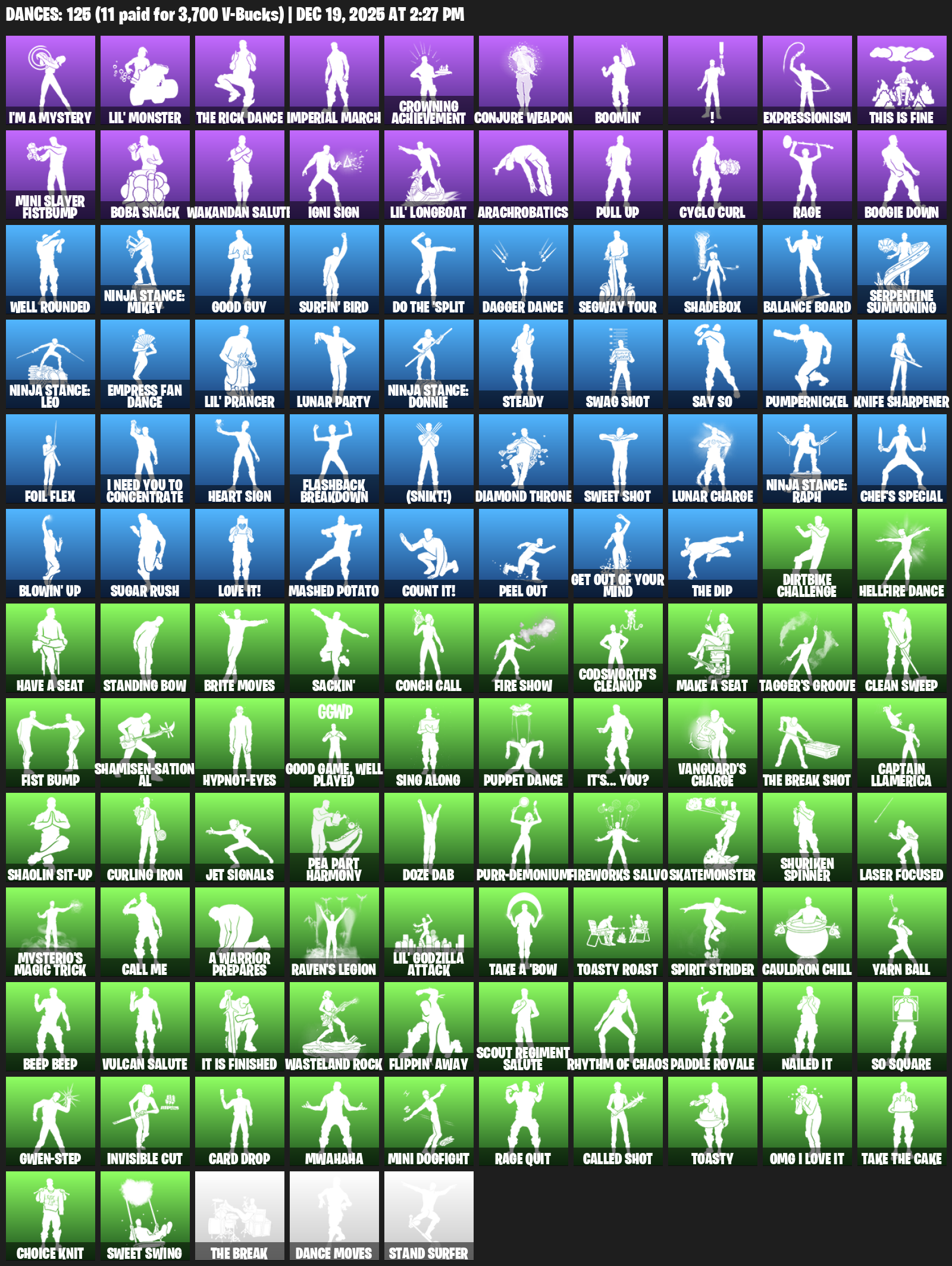 I’m a Mystery, Lil’ Monster, Imperial March, Crowning Achievement, Conjure Weapon, Boomin’, !, Expressionism, This is Fine, Mini Slayer Fistbump, Boba Snack, Wakandan Salute, Igni Sign, Arachrobatics, Pull Up, Cyclo Curl, Rage, Boogie Down