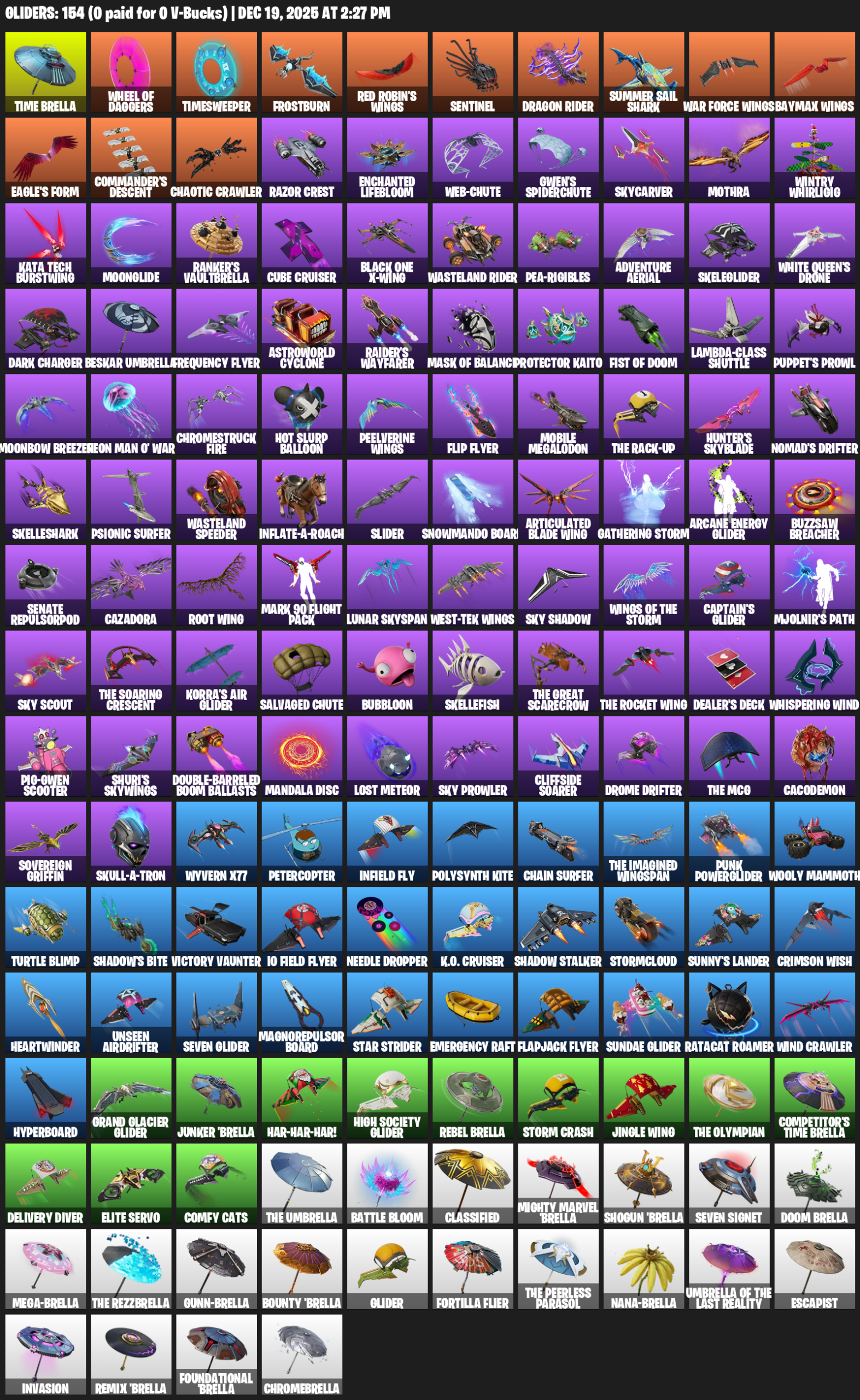 Time Brella, Wheel of Daggers, Timesweeper, Frostburn, Red Robin’s Wings, Sentinel, Summer Sail Shark, Eagle’s Form, Commander’s Descent, Chaotic Crawler, Razor Crest, Enchanted Lifebloom, Gwen’s Spiderchute, Skycarver, Mothra, Wintry Whirligig