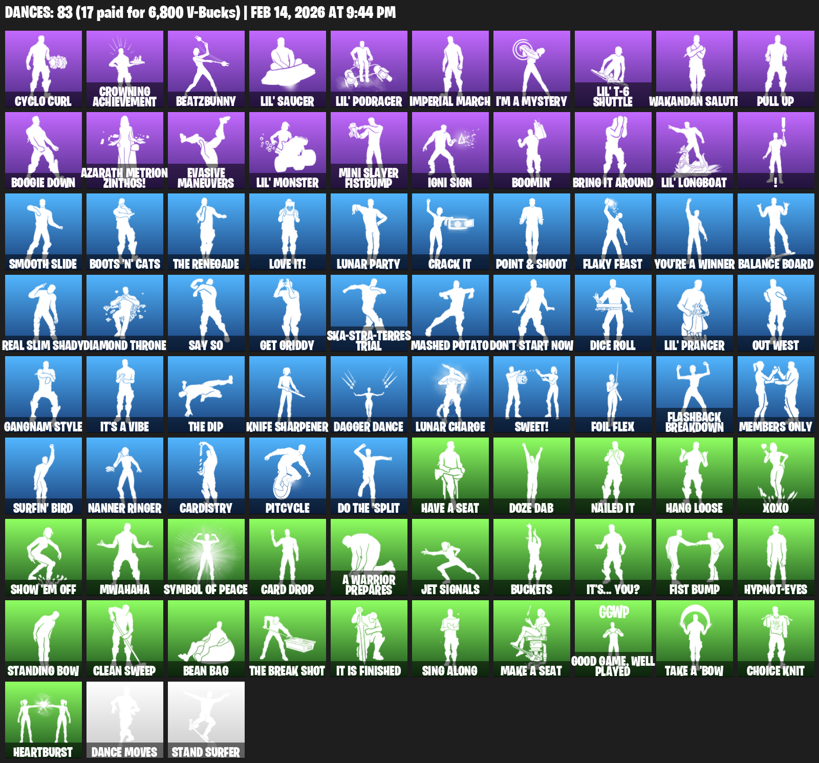 Cyclo Curl, Crowning Achievement, BeatzBunny, Lil’ Saucer, Imperial March, I’m a Mystery, Wakandan Salute, Pull Up, Boogie Down, Azarath Metrion Zinthos!, Evasive Maneuvers, Mini Slayer Fistbump, Igni Sign, Boomin’, Bring it around, !