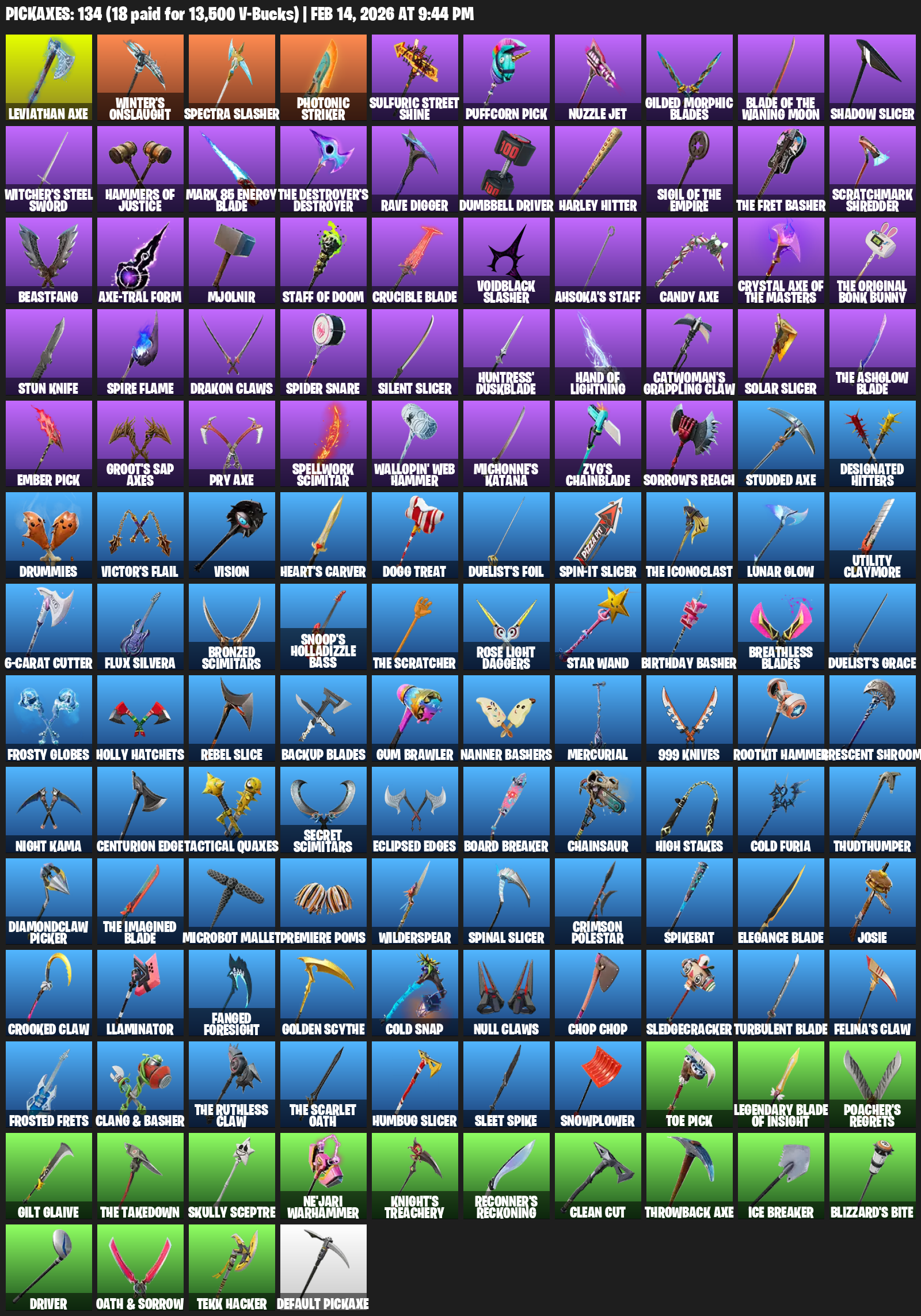 Leviathan Axe, Winter’s Onslaught, Photonic Striker, Sulfuric Street Shine, Puffcorn Pick, Nuzzle Jet, Gilded Morphic Blades, Blade of the Waning Moon, Shadow Slicer, Witcher’s Steel Sword, Rave Digger, Dumbbell Driver, Harley Hitter, Scratchmark Shredder