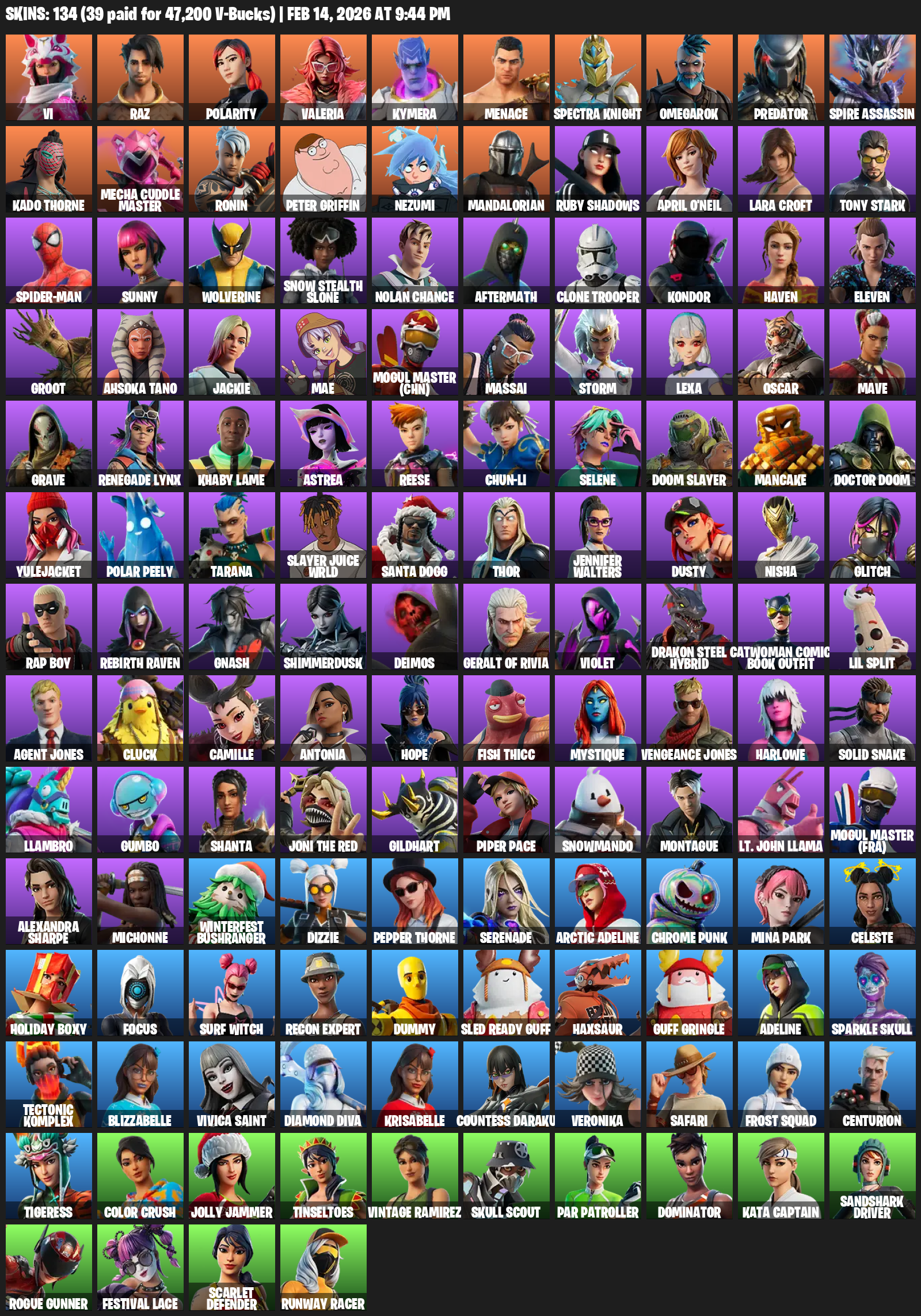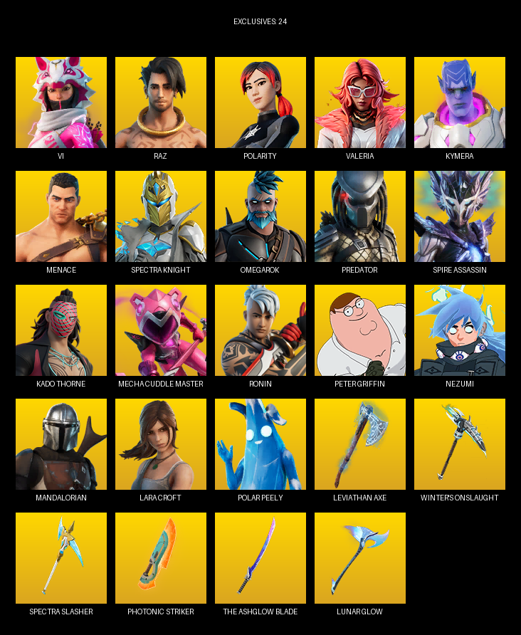 Lara Croft, Vi, Raz, Polarity, Valeria, Kymera, Menace, Spectra Knight, Omegarok, Predator, Spire Assassin, Kado Thorne, Mecha Cuddle Master, Ronin, Peter Griffin, Nezumi, Mandalorian, Ruby Shadows, April O’Neil, Tony Stark