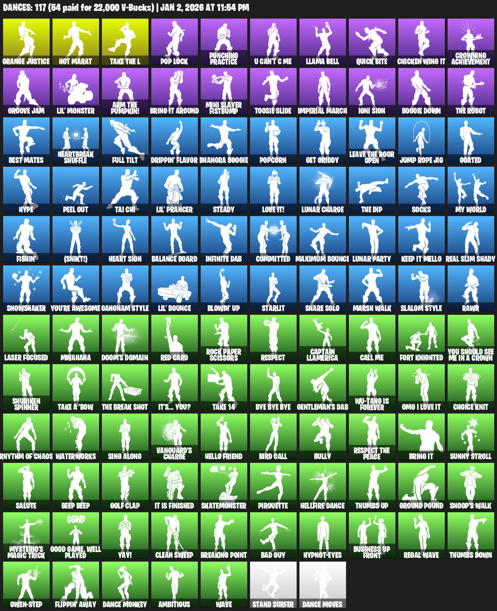 Hot Marat, Orange Justice, Pop Lock, Punching Practice, U Can’t C Me, Llama Bell, Quick Bite, Chicken Wing It, Crowning Achievement, Groove Jam, Lil’ Monster, Mini Slayer Fistbump, Toosie Slide, Imperial March, Igni Sign, Boogie Down