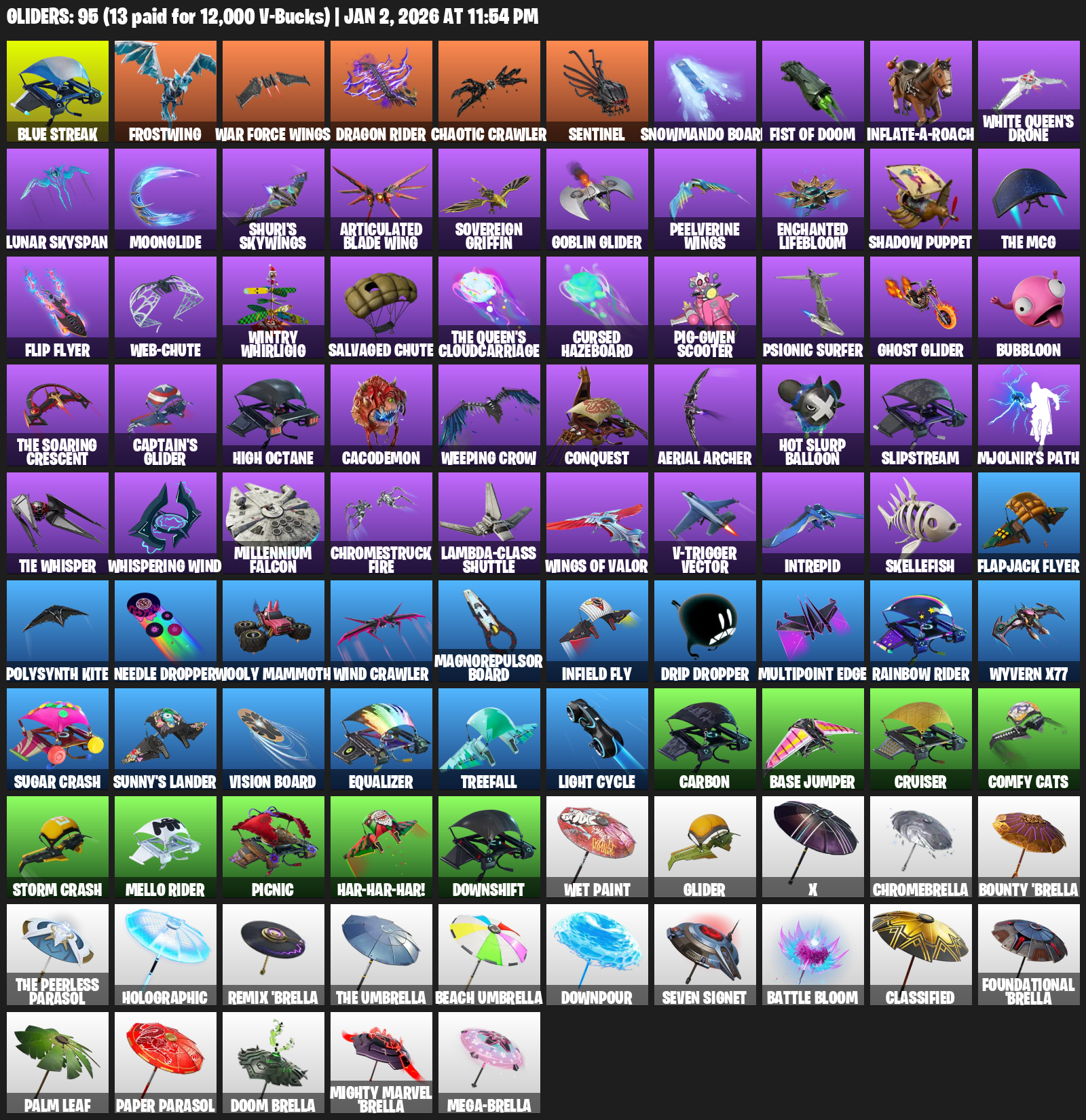 Frostwing, War Force Wings, Chaotic Crawler, Sentinel, Snowmando Board, Fist of Doom, Inflate-A-Roach, White Queen’s Drone, Lunar Skyspan, Moonglide, Shuri’s Skywings, Sovereign Griffin, Goblin Glider, Enchanted Lifebloom, Shadow Puppet