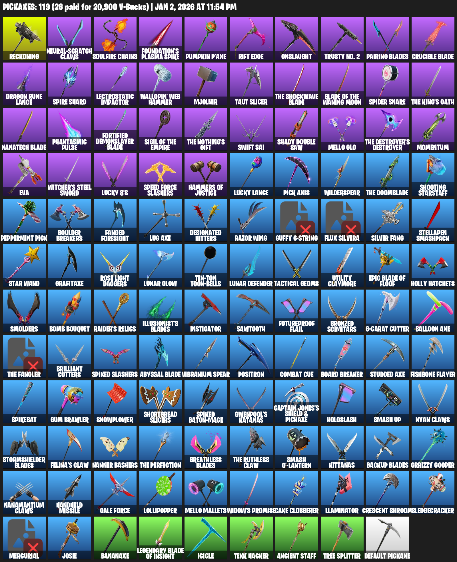 Reckoning, Neural-Scratch Claws, Soulfire Chains, Foundation’s Plasma Spike, Pumpkin P’axe, Rift Edge, Onslaught, Trusty No. 2, Pairing Blades, Crucible Blade, Dragon Rune Lance, Spire Shard, Lectrostatic Impactor, Wallopin’ Web Hammer, Mjolnir, Taut Slicer, Spider Snare