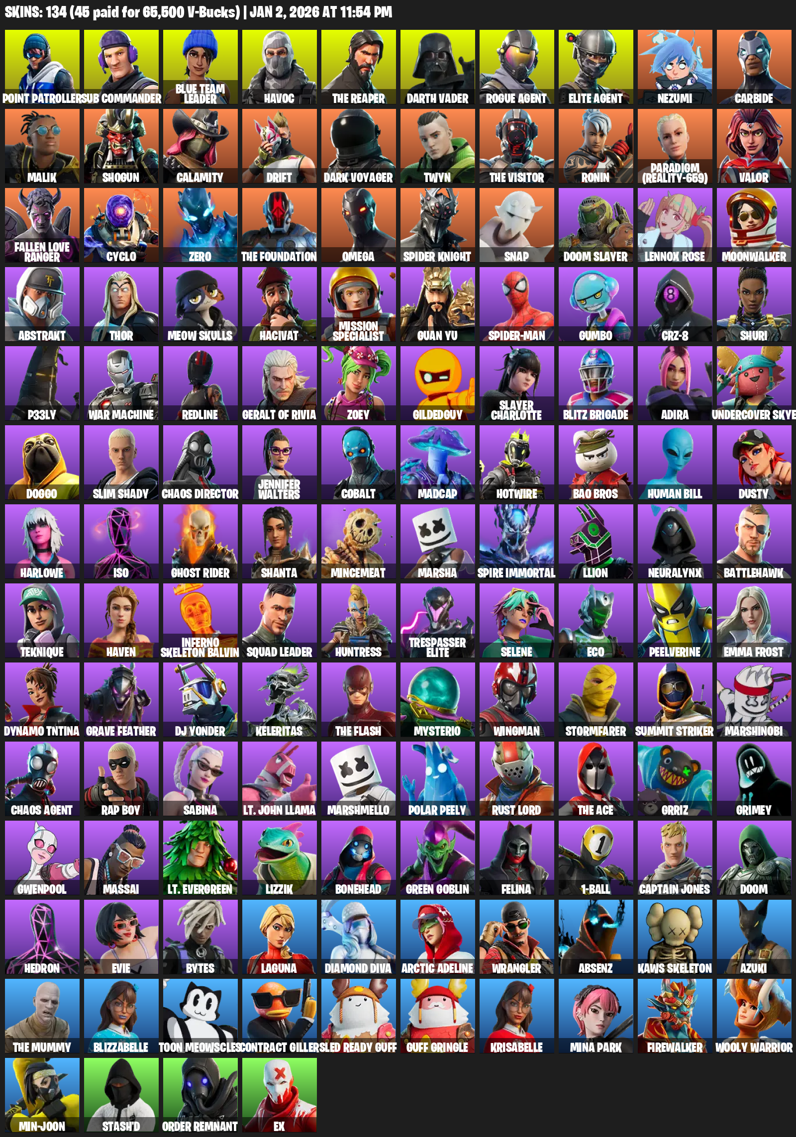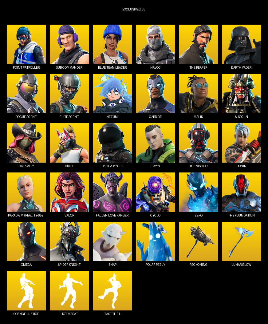 Point Patroller, The Reaper, Elite Agent, Omega, Sub Commander, Blue Team Leader, Havoc, Darth Vader, Nezumi, Carbide, Malik, Shogun, Calamity, Drift, Dark Voyager, Twyn, Ronin, Paradigm (Reality-659)