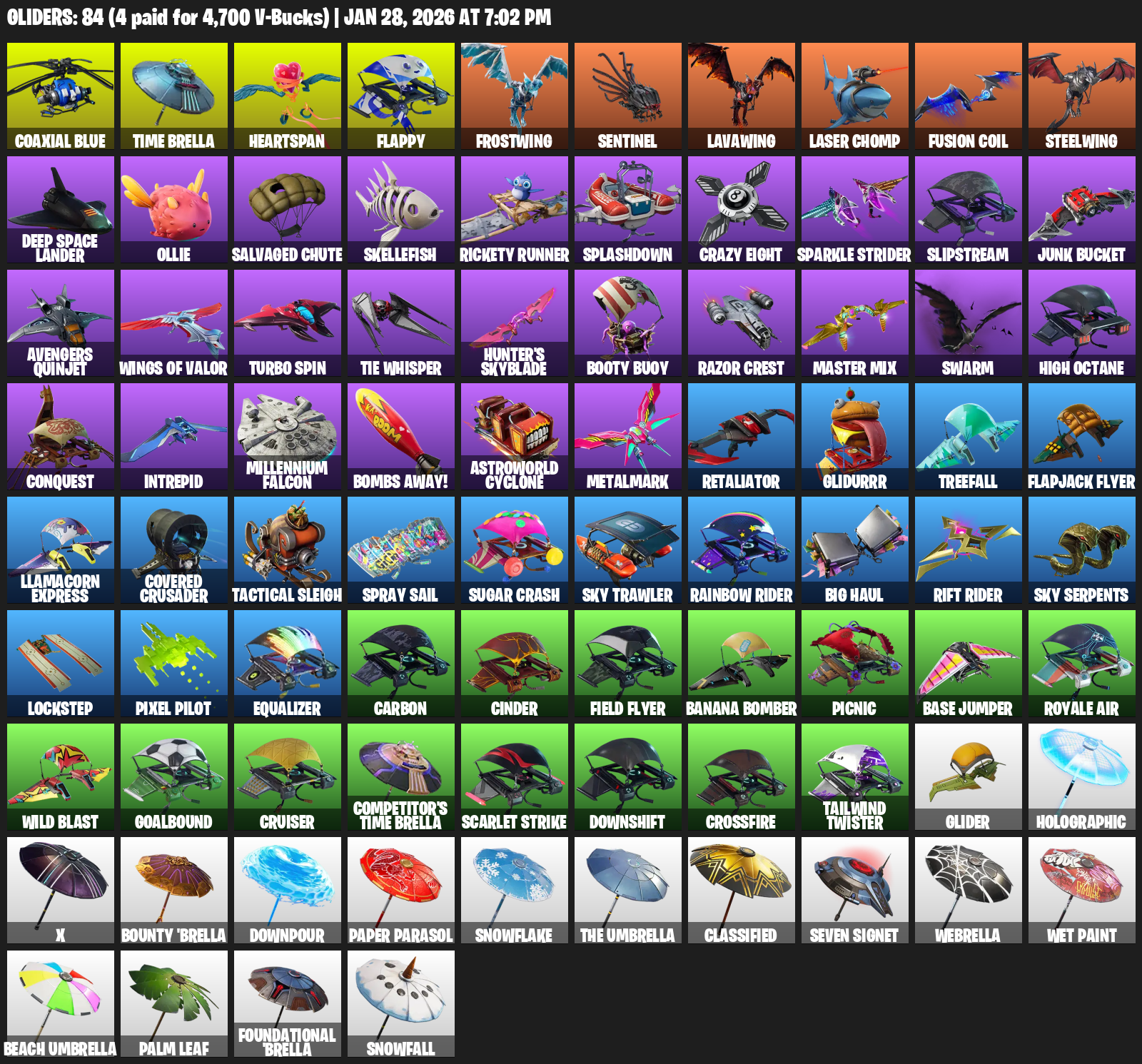 Time Brella, Heartspan, Flappy, Frostwing, Sentinel, Lavawing, Steelwing, Deep Space Lander, Ollie, Salvaged Chute, Skellefish, Rickety Runner, Splashdown, Crazy Eight, Sparkle Strider, Slipstream, Junk Bucket