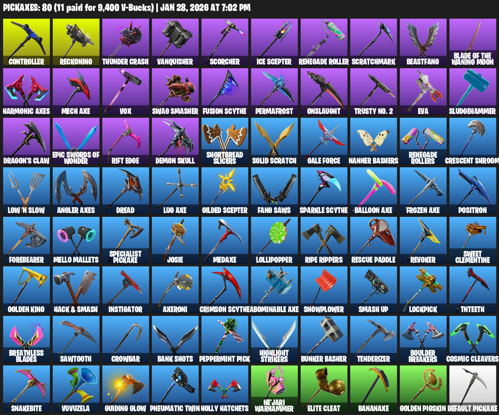 Controller, Reckoning, Thunder Crash, Vanquisher, Scorcher, Ice Scepter, Renegade Roller, Scratchmark, Beastfang, Harmonic Axes, Mech Axe, Vox, Swag Smasher, Fusion Scythe, Permafrost, Onslaught, Trusty No. 2, EVA, Sludgehammer