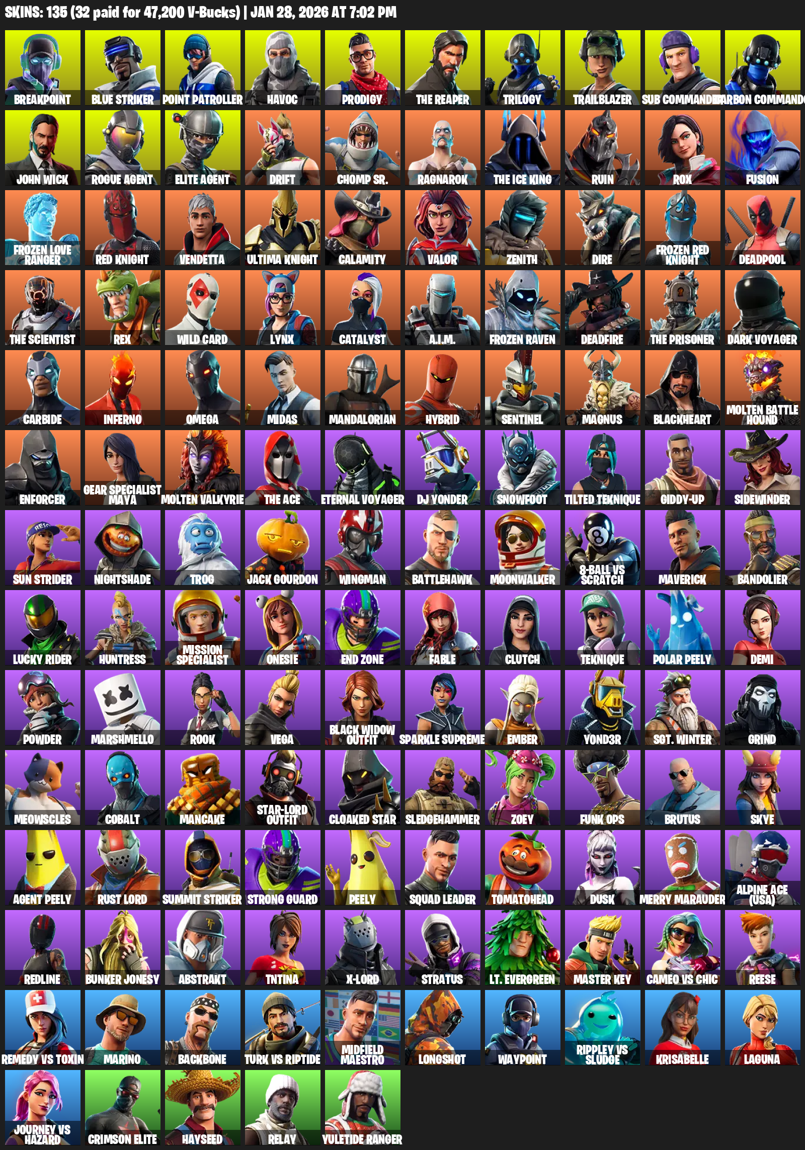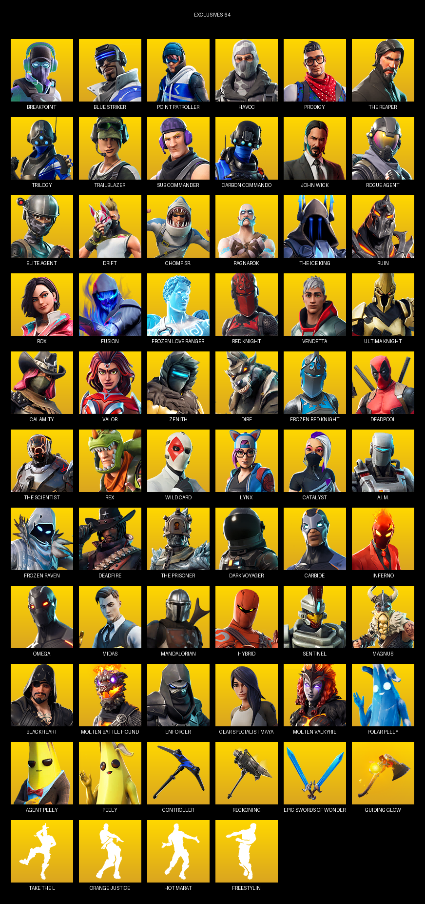 Point Patroller, The Reaper, Elite Agent, Omega, Gear Specialist Maya, Breakpoint, Blue Striker, Havoc, Prodigy, Trilogy, Trailblazer, Sub Commander, Carbon Commando, John Wick, Drift, Chomp Sr., Ragnarok, Ruin
