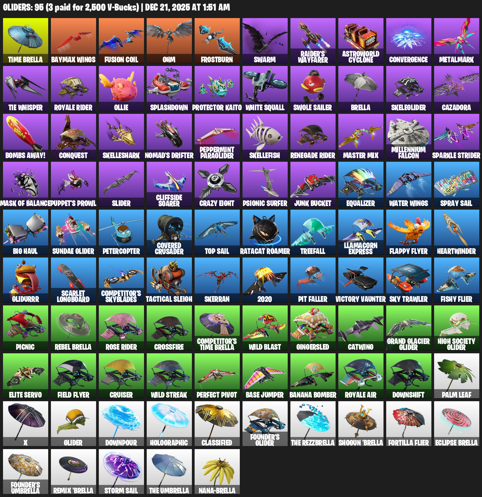 Time Brella, Baymax Wings, Ohm, Frostburn, Swarm, Raider’s Wayfarer, Astroworld Cyclone, Convergence, Metalmark, TIE Whisper, Royale Rider, Ollie, Splashdown, Protector Kaito, White Squall, Swole Sailer, Skeleglider, Cazadora