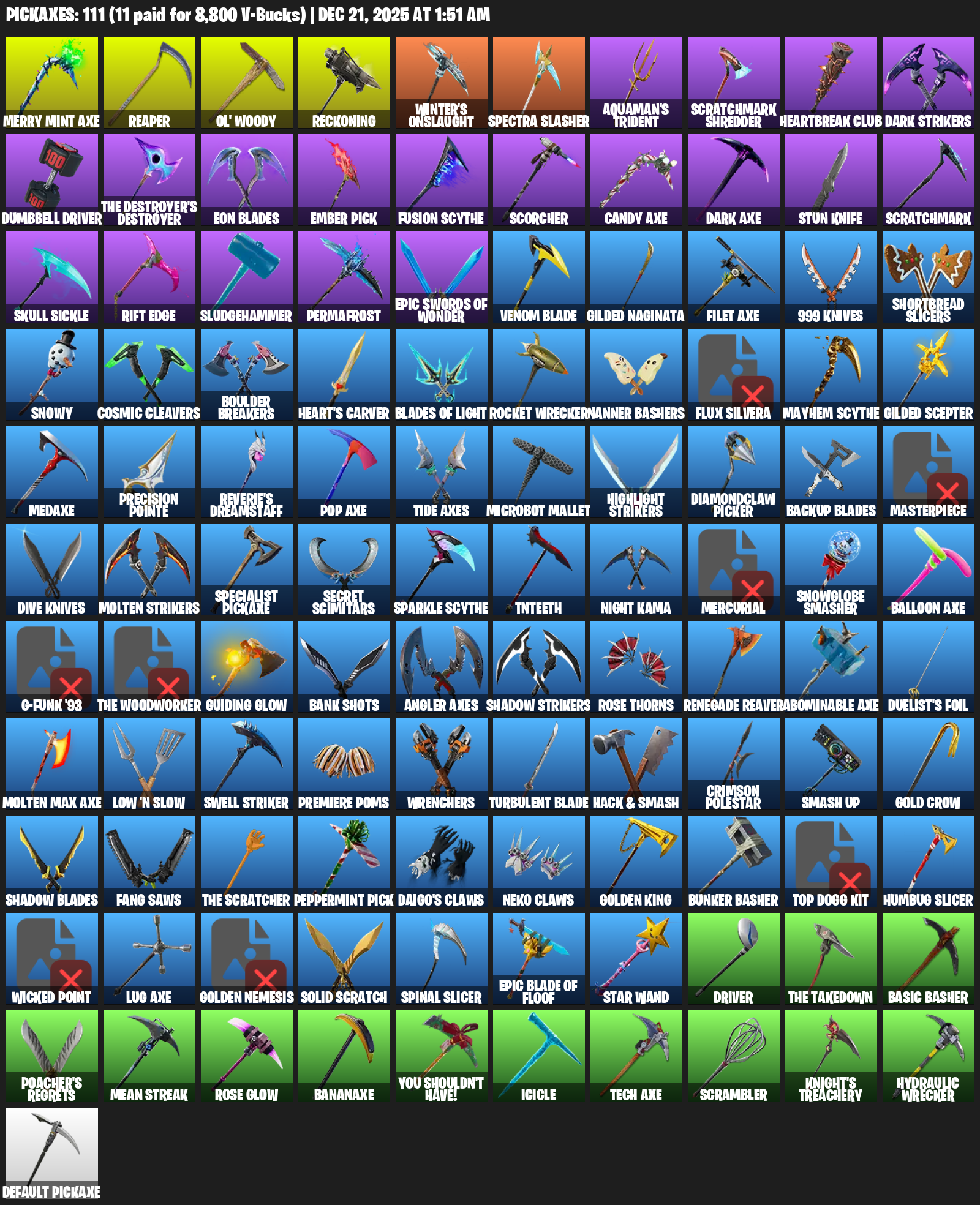 Merry Mint Axe, Reaper, Ol’ Woody, Reckoning, Winter’s Onslaught, Spectra Slasher, Aquaman’s Trident, Scratchmark Shredder, Heartbreak Club, Dark Strikers, Dumbbell Driver, Eon Blades, Ember Pick, Scorcher, Stun Knife