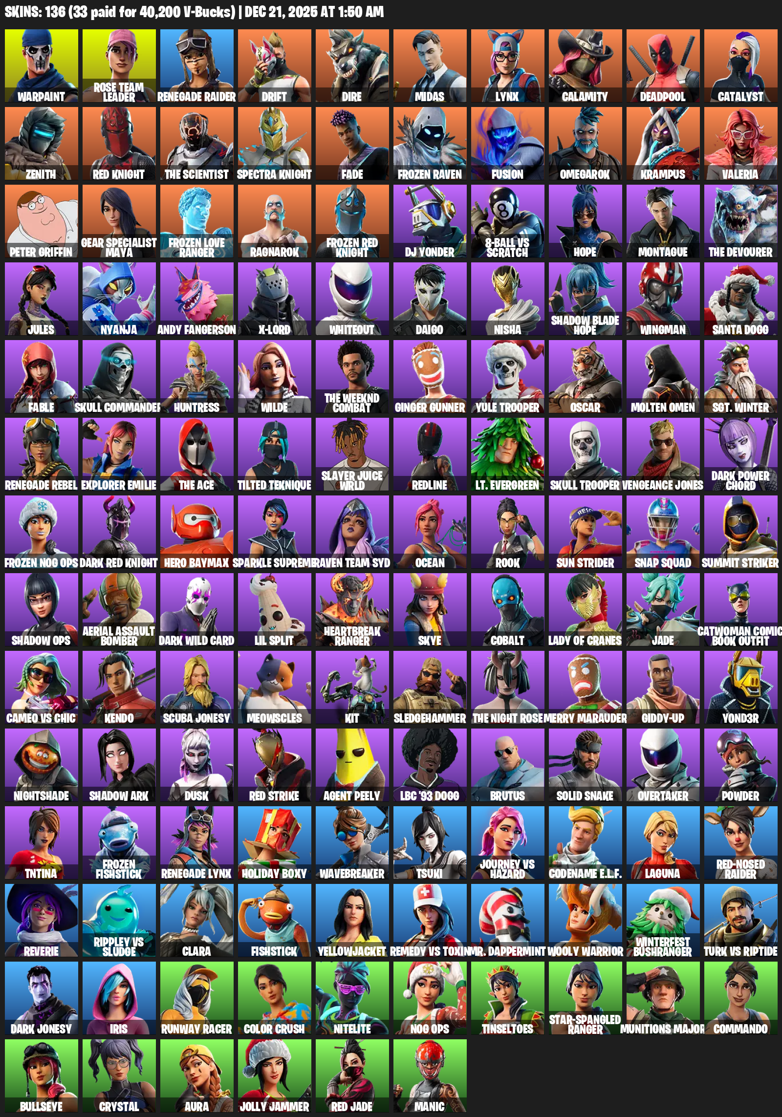 Renegade Raider, Gear Specialist Maya, Warpaint, Rose Team Leader, Drift, Dire, Midas, Lynx, Calamity, Deadpool, Catalyst, Zenith, Red Knight, The Scientist, Fade, Frozen Raven, Fusion, Omegarok, Krampus