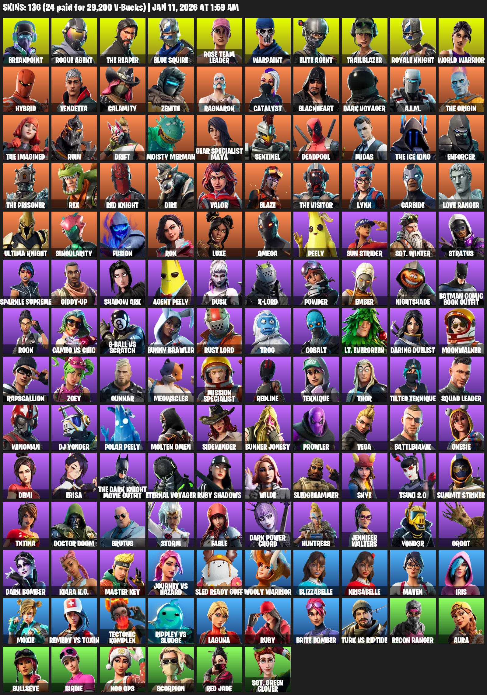 The Reaper, Blue Squire, Elite Agent, Royale Knight, Gear Specialist Maya, Omega, Breakpoint, Rose Team Leader, Warpaint, Trailblazer, World Warrior, Hybrid, Vendetta, Calamity, Zenith, Ragnarok, Catalyst, Blackheart, Dark Voyager