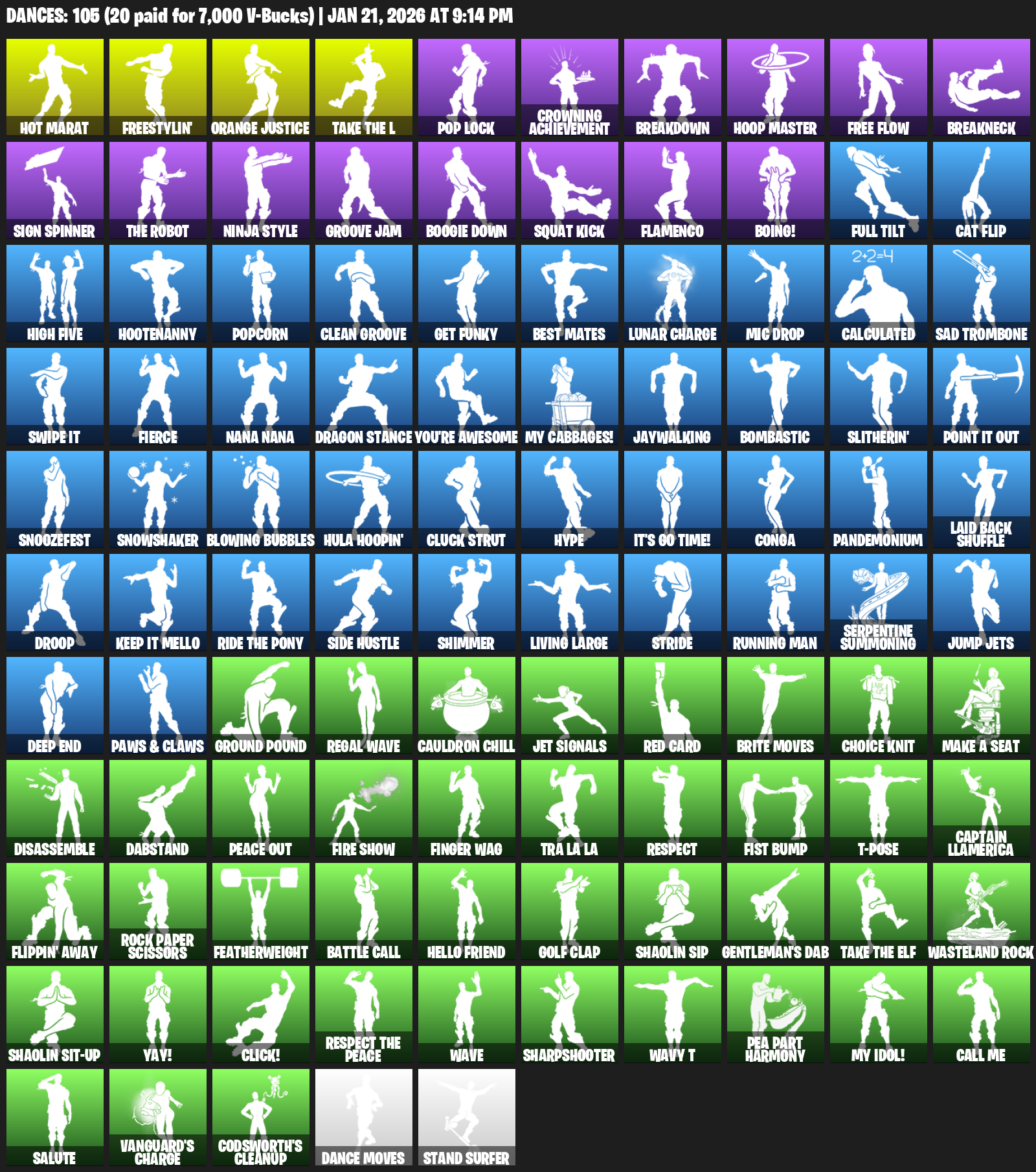 Hot Marat, Freestylin’, Orange Justice, Pop Lock, Crowning Achievement, Breakdown, Hoop Master, Free Flow, Breakneck, Sign Spinner, Ninja Style, Groove Jam, Boogie Down, Squat Kick, Flamenco, Boing!, Cat Flip