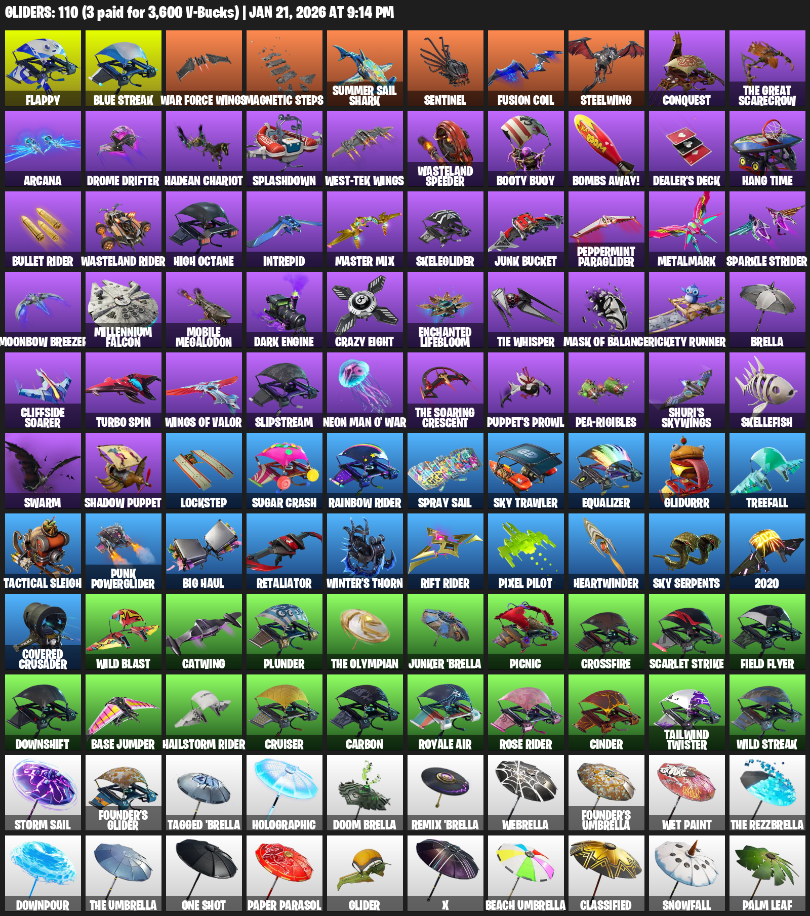Flappy, War Force Wings, Magnetic Steps, Summer Sail Shark, Sentinel, Fusion Coil, Steelwing, Conquest, Arcana, Drome Drifter, Splashdown, Wasteland Speeder, Booty Buoy, Bombs Away!, Dealer’s Deck, Hang Time