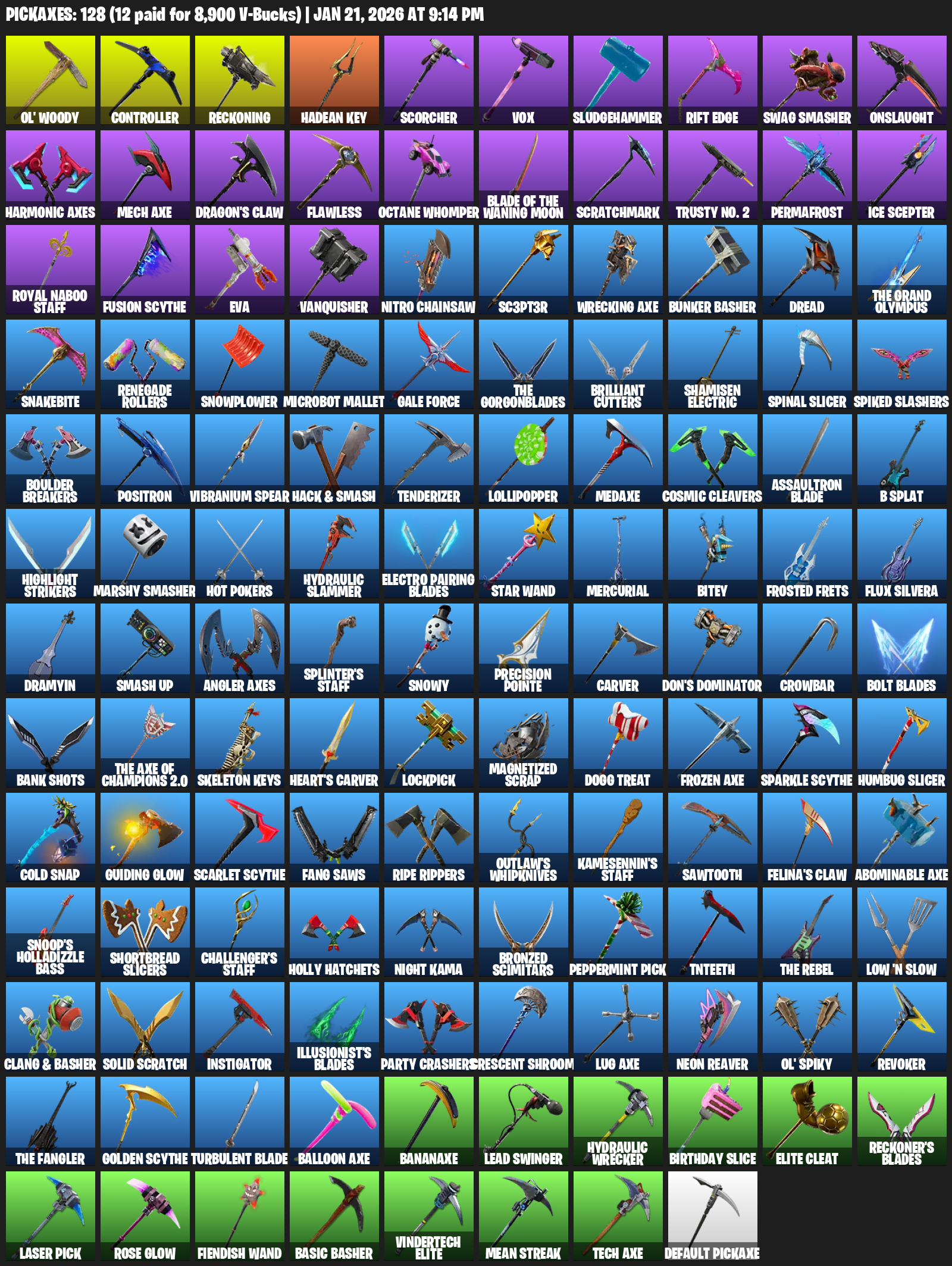Ol’ Woody, Controller, Reckoning, Hadean Key, Scorcher, Vox, Sludgehammer, Rift Edge, Swag Smasher, Onslaught, Harmonic Axes, Mech Axe, Dragon’s Claw, Flawless, Octane Whomper, Scratchmark, Trusty No. 2, Permafrost, Ice Scepter