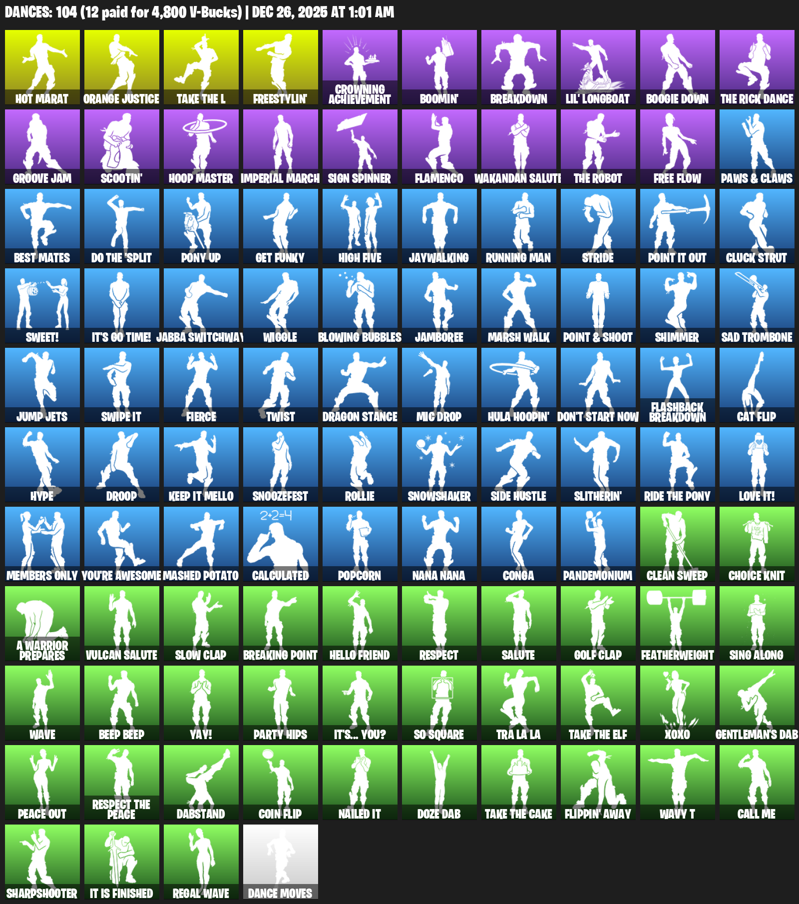 Hot Marat, Orange Justice, Freestylin’, Crowning Achievement, Boomin’, Breakdown, Lil’ Longboat, Boogie Down, Groove Jam, Scootin’, Hoop Master, Imperial March, Sign Spinner, Flamenco, Wakandan Salute, Free Flow, Paws & Claws