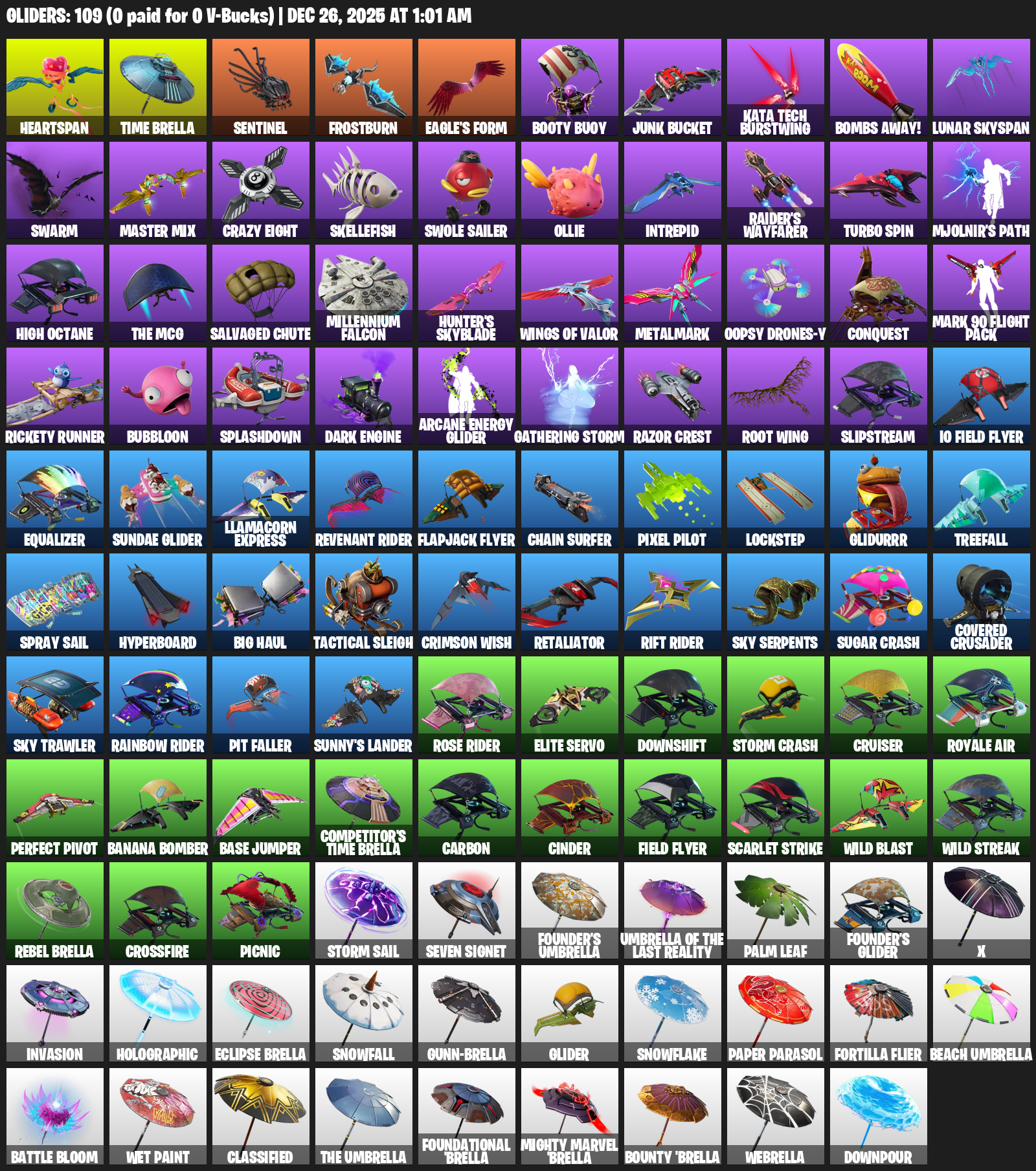 Heartspan, Time Brella, Sentinel, Frostburn, Eagle’s Form, Booty Buoy, Junk Bucket, Kata Tech Burstwing, Bombs Away!, Lunar Skyspan, Swarm, Crazy Eight, Skellefish, Swole Sailer, Ollie, Intrepid, Raider’s Wayfarer, Turbo Spin, Mjolnir’s Path