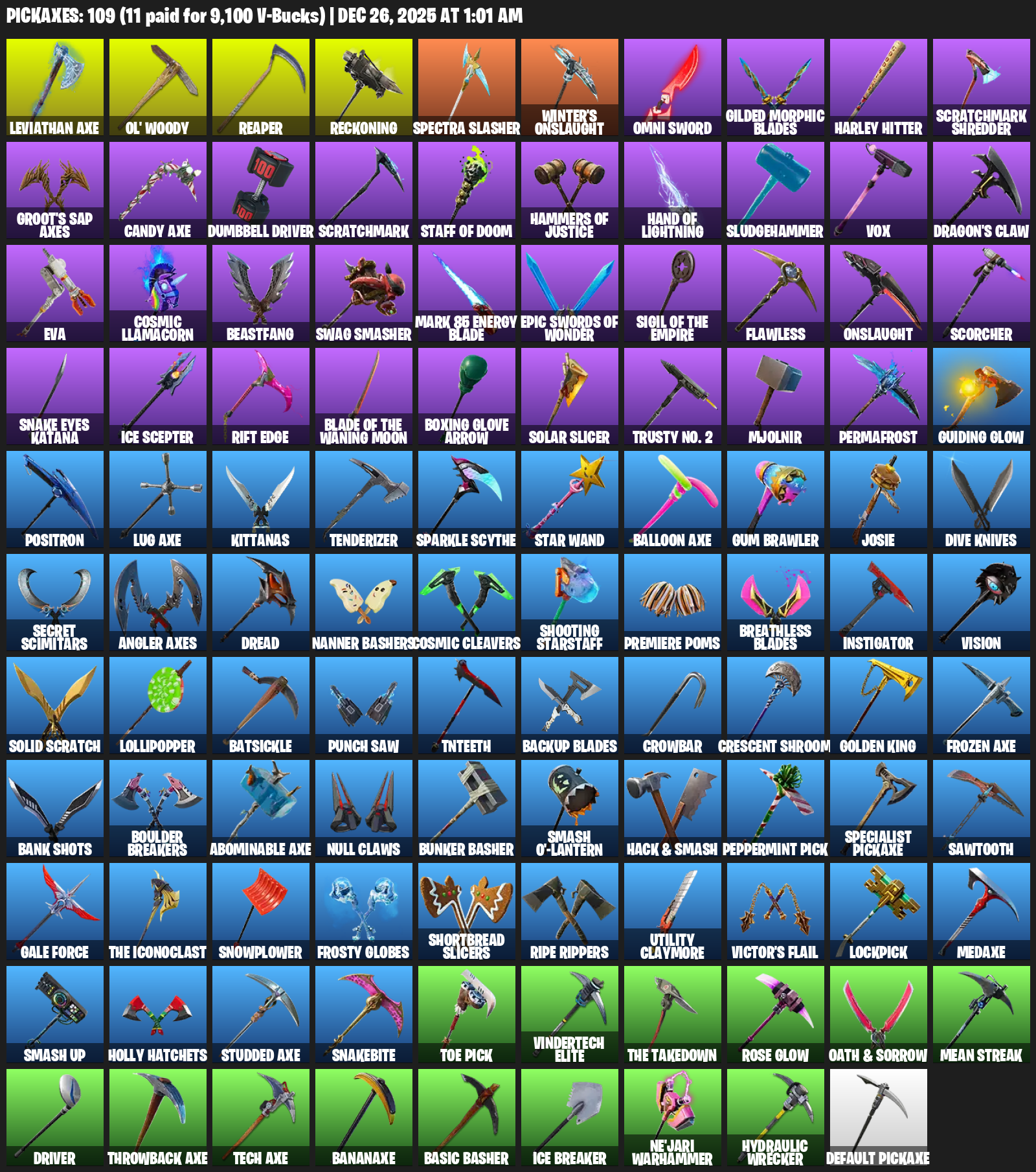 Leviathan Axe, Ol’ Woody, Reckoning, Winter’s Onslaught, Omni Sword, Gilded Morphic Blades, Harley Hitter, Scratchmark Shredder, Groot’s Sap Axes, Dumbbell Driver, Staff of Doom, Sludgehammer, Vox, Dragon’s Claw