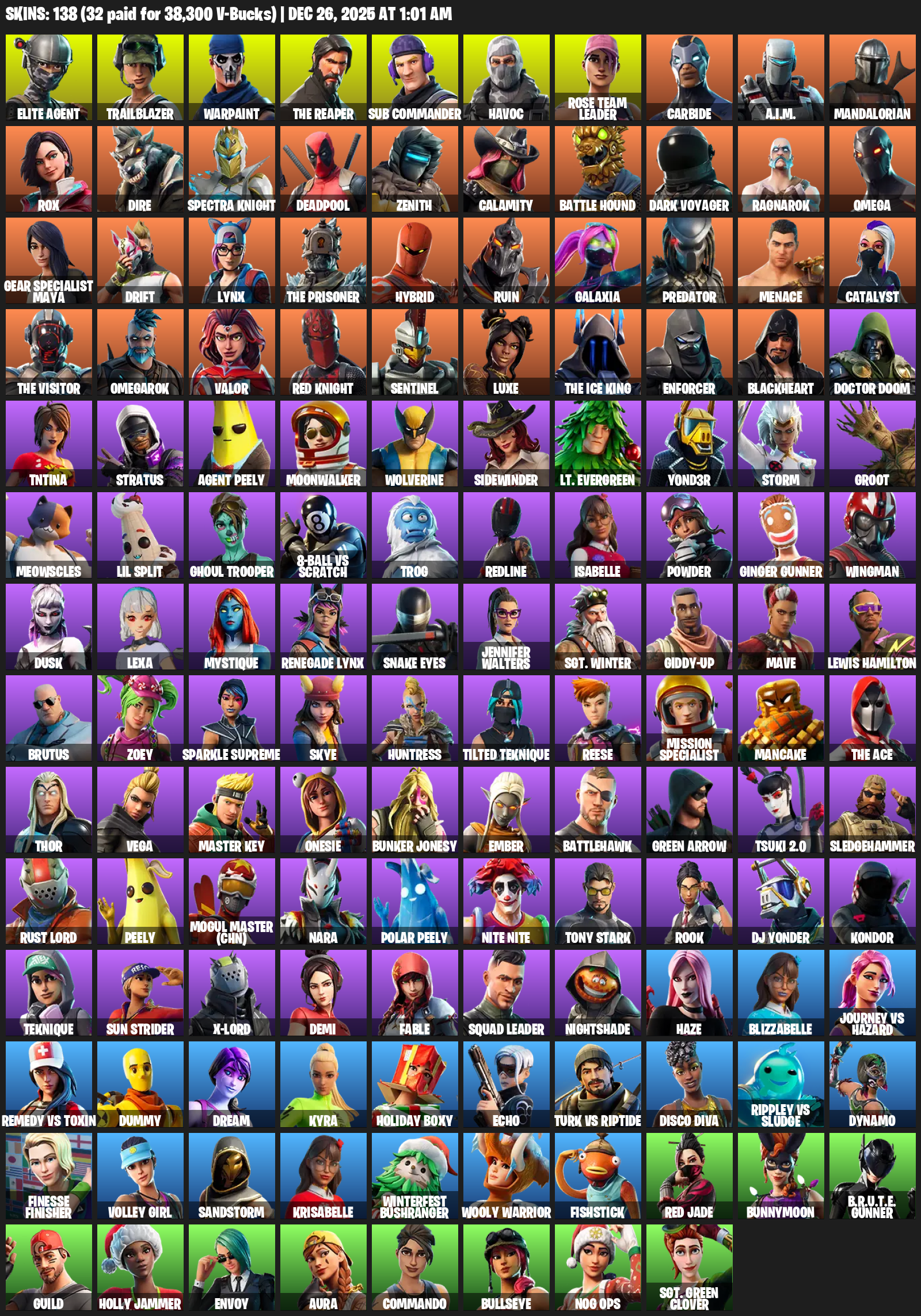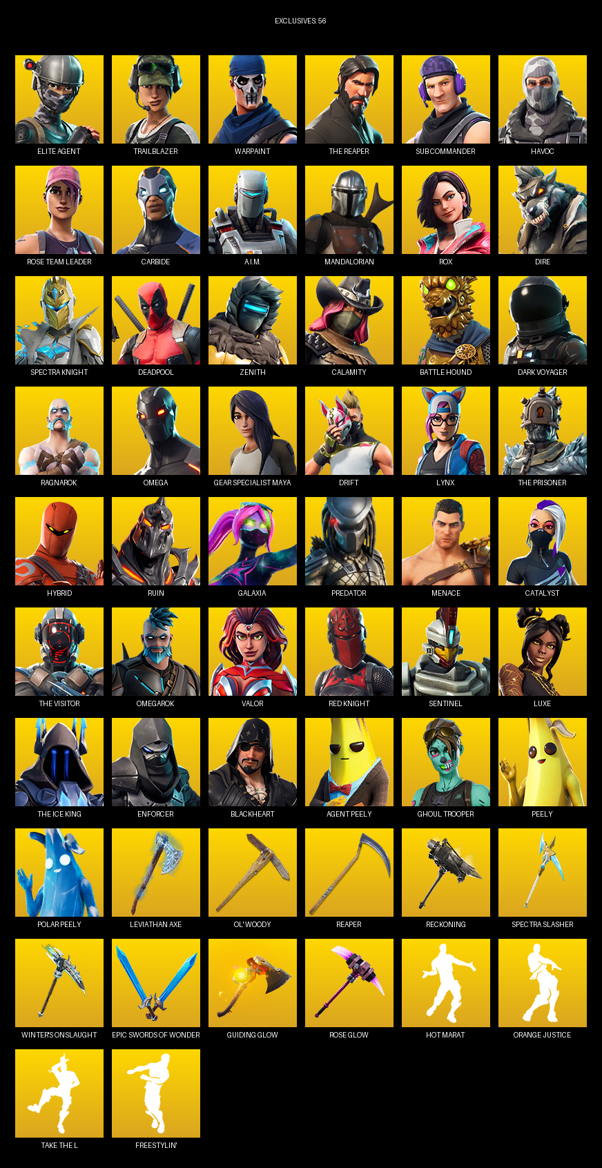 Elite Agent, The Reaper, Omega, Gear Specialist Maya, Trailblazer, Warpaint, Sub Commander, Havoc, Rose Team Leader, Carbide, A.I.M., Mandalorian, Rox, Dire, Spectra Knight, Deadpool, Zenith, Calamity, Battle Hound, Dark Voyager