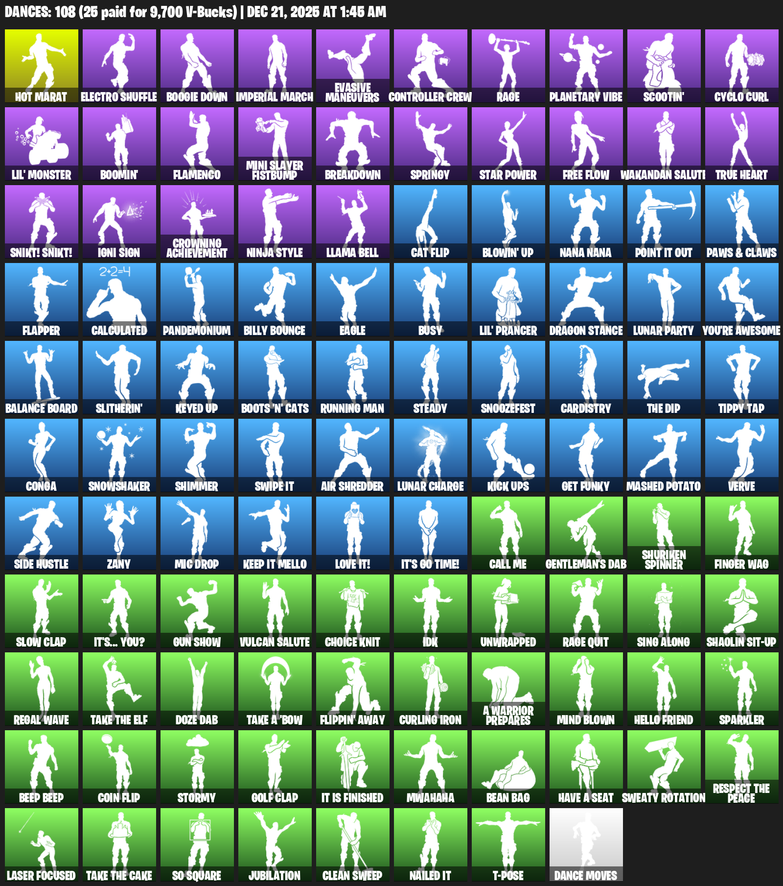 Hot Marat, Electro Shuffle, Boogie Down, Imperial March, Evasive Maneuvers, Controller Crew, Rage, Planetary Vibe, Scootin’, Cyclo Curl, Lil’ Monster, Boomin’, Flamenco, Mini Slayer Fistbump, Breakdown, Springy, Star Power, Free Flow, Wakandan Salute, True Heart