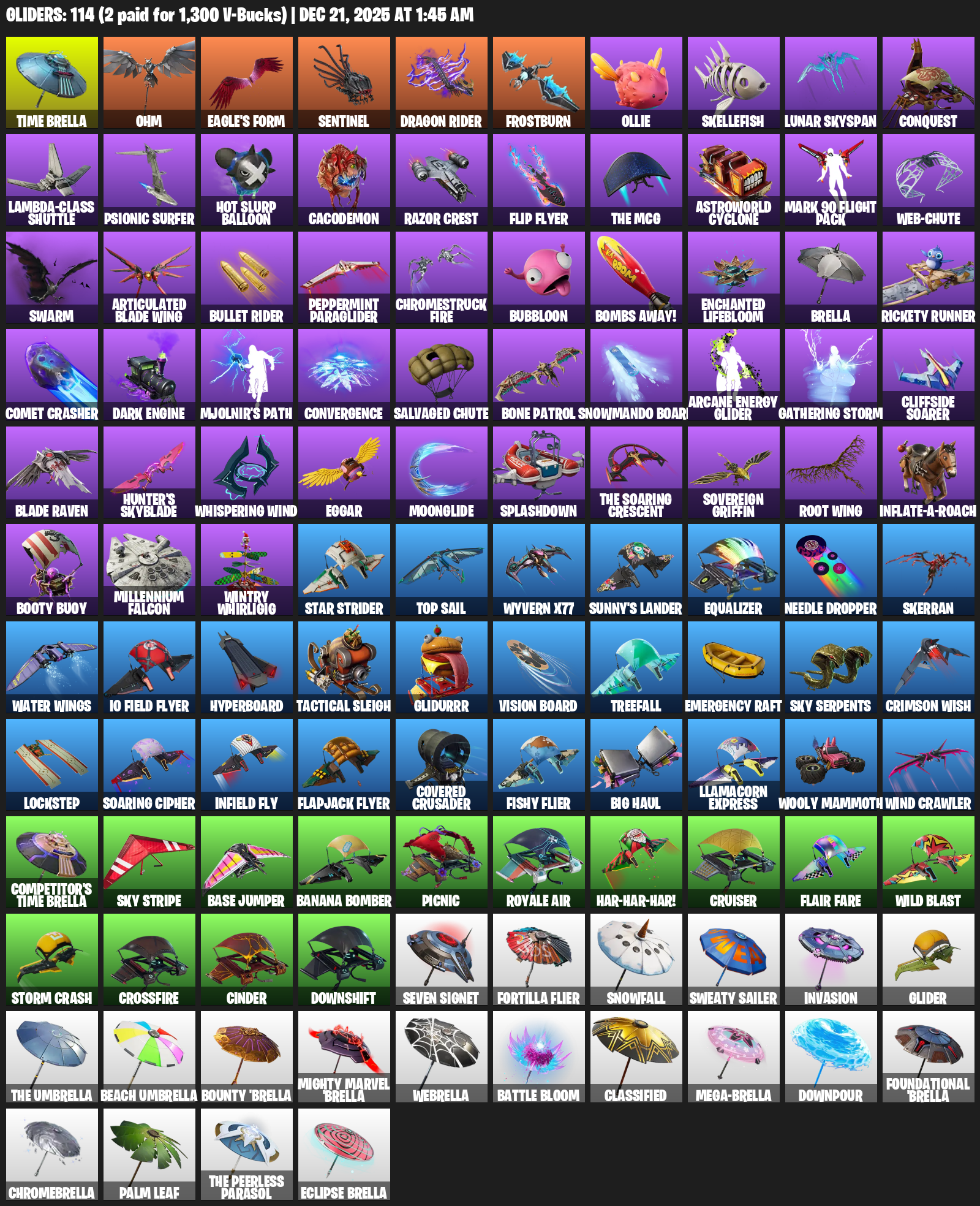 Time Brella, Ohm, Eagle’s Form, Sentinel, Frostburn, Ollie, Skellefish, Lunar Skyspan, Conquest, Lambda-Class Shuttle, Psionic Surfer, Cacodemon, Razor Crest, Flip Flyer, Astroworld Cyclone