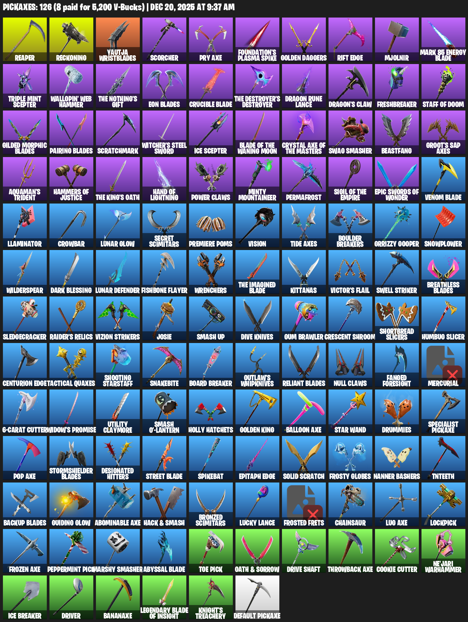 Reaper, Reckoning, Yautja Wristblades, Scorcher, Pry Axe, Foundation’s Plasma Spike, Golden Daggers, Rift Edge, Mjolnir, Mark 85 Energy Blade, Triple Mint Scepter, Wallopin’ Web Hammer, Eon Blades, Dragon Rune Lance, Dragon’s Claw, Freshbreaker, Staff of Doom