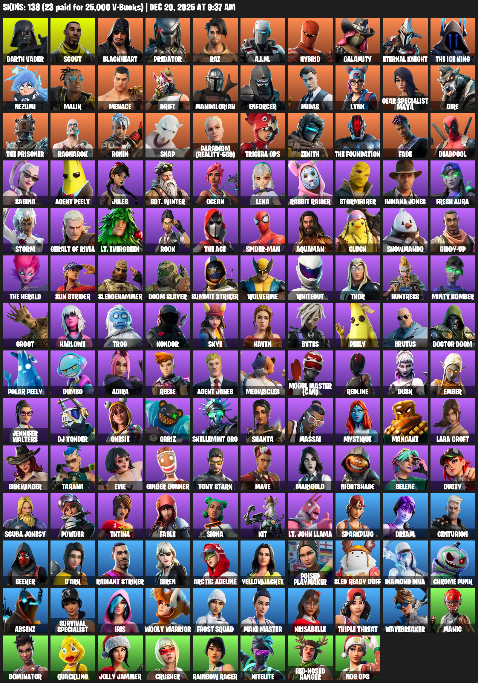 Gear Specialist Maya, Lara Croft, Darth Vader, Scout, Blackheart, Predator, Raz, A.I.M., Hybrid, Calamity, Eternal Knight, The Ice King, Nezumi, Malik, Menace, Drift, Mandalorian, Enforcer, Midas, Lynx