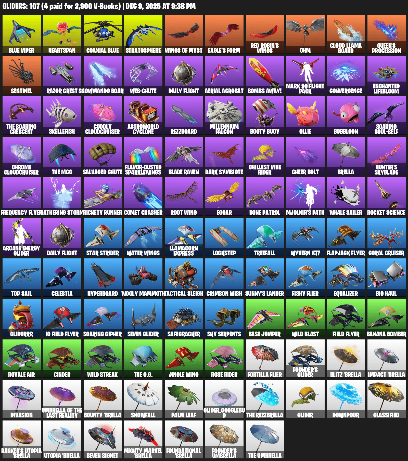 Blue Viper, Heartspan, Stratosphere, Wings of Myst, Eagle’s Form, Ohm, Queen’s Procession, Sentinel, Razor Crest, Snowmando Board, Web-Chute, Daily Flight, Aerial Acrobat, Bombs Away!, Convergence, Enchanted Lifebloom