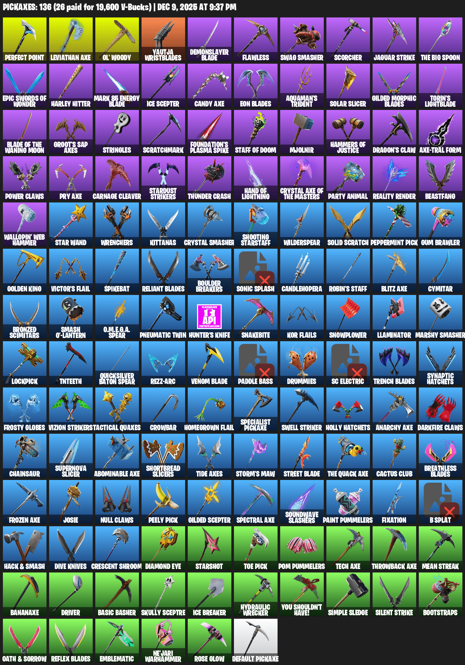 Leviathan Axe, Ol’ Woody, Yautja Wristblades, Demonslayer Blade, Flawless, Swag Smasher, Scorcher, Jaguar Strike, Harley Hitter, Eon Blades, Aquaman’s Trident, Solar Slicer, Torin’s Lightblade