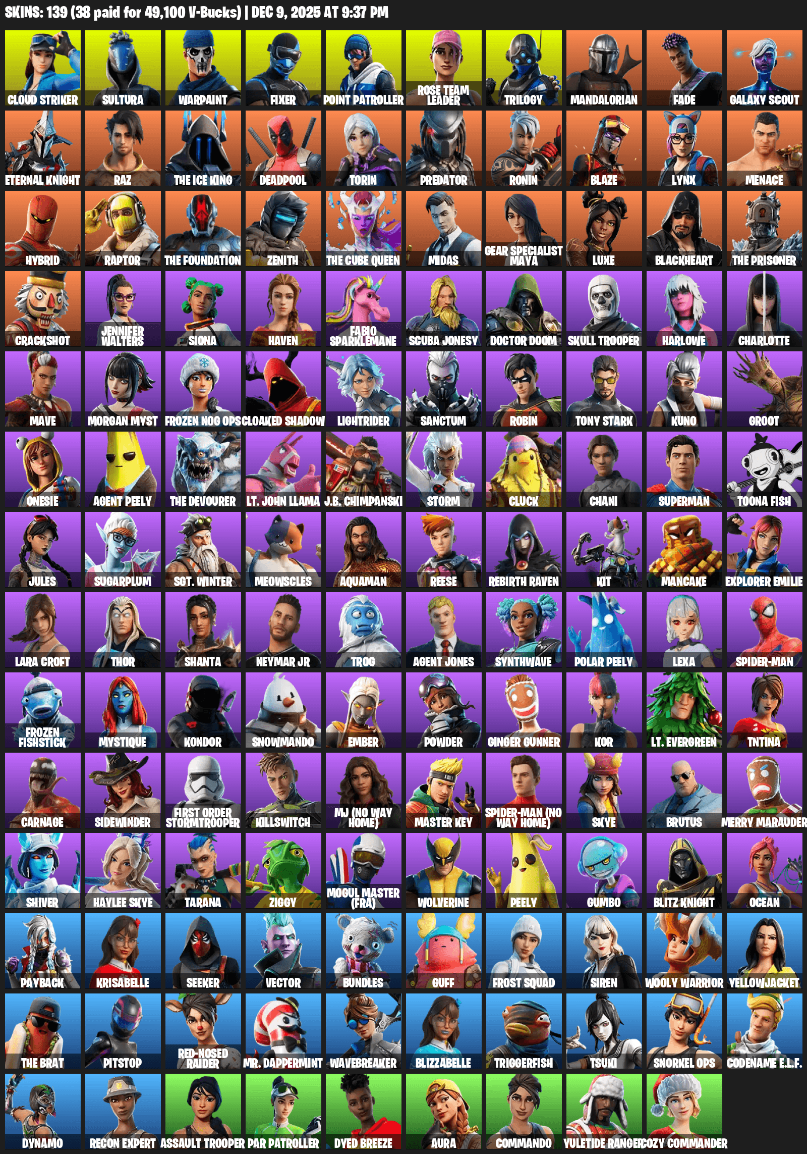 Point Patroller, Gear Specialist Maya, Lara Croft, Cloud Striker, Sultura, Warpaint, Fixer, Rose Team Leader, Trilogy, Mandalorian, Fade, Galaxy Scout, Eternal Knight, Raz, The Ice King, Deadpool, Torin, Predator, Ronin, Blaze