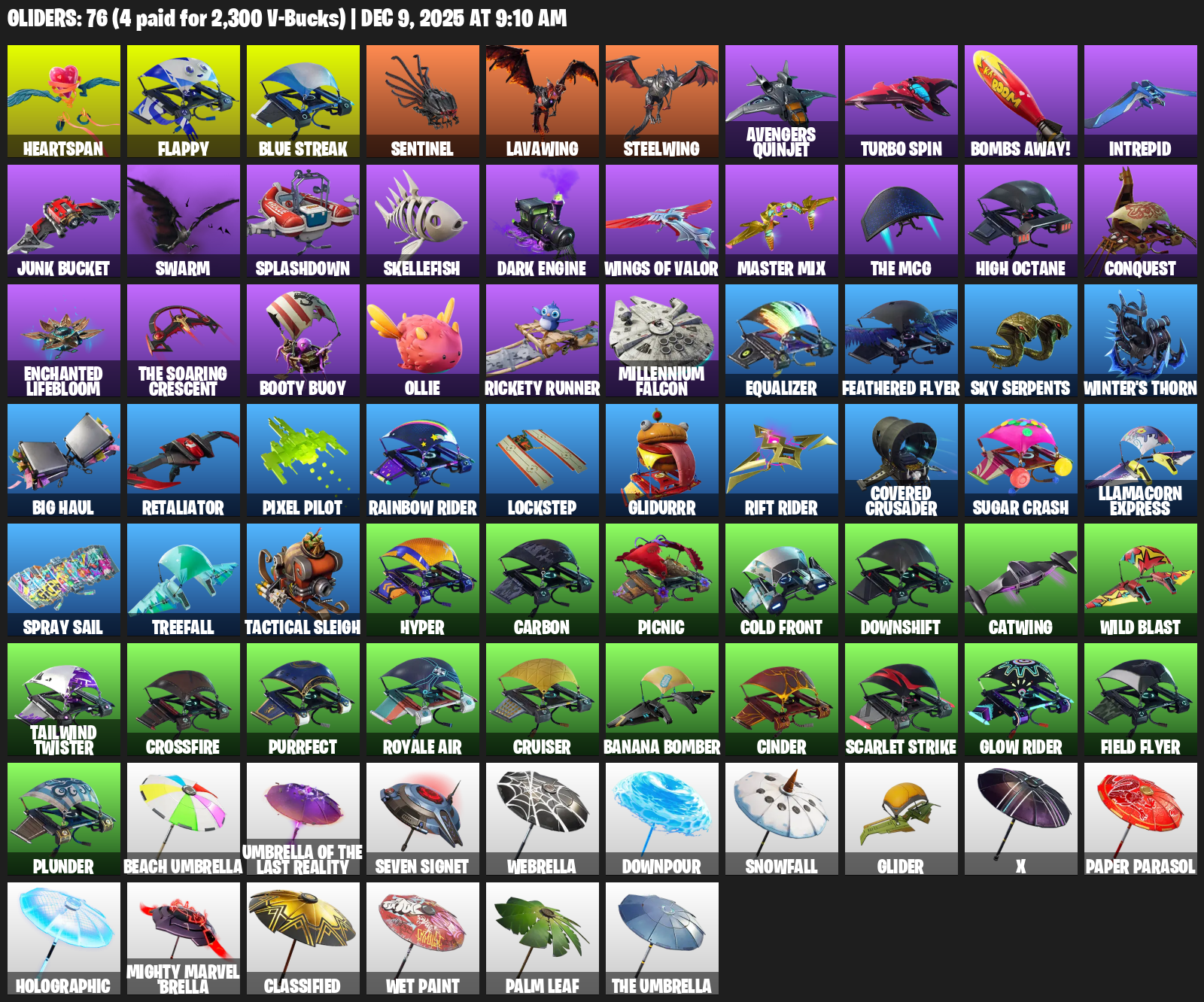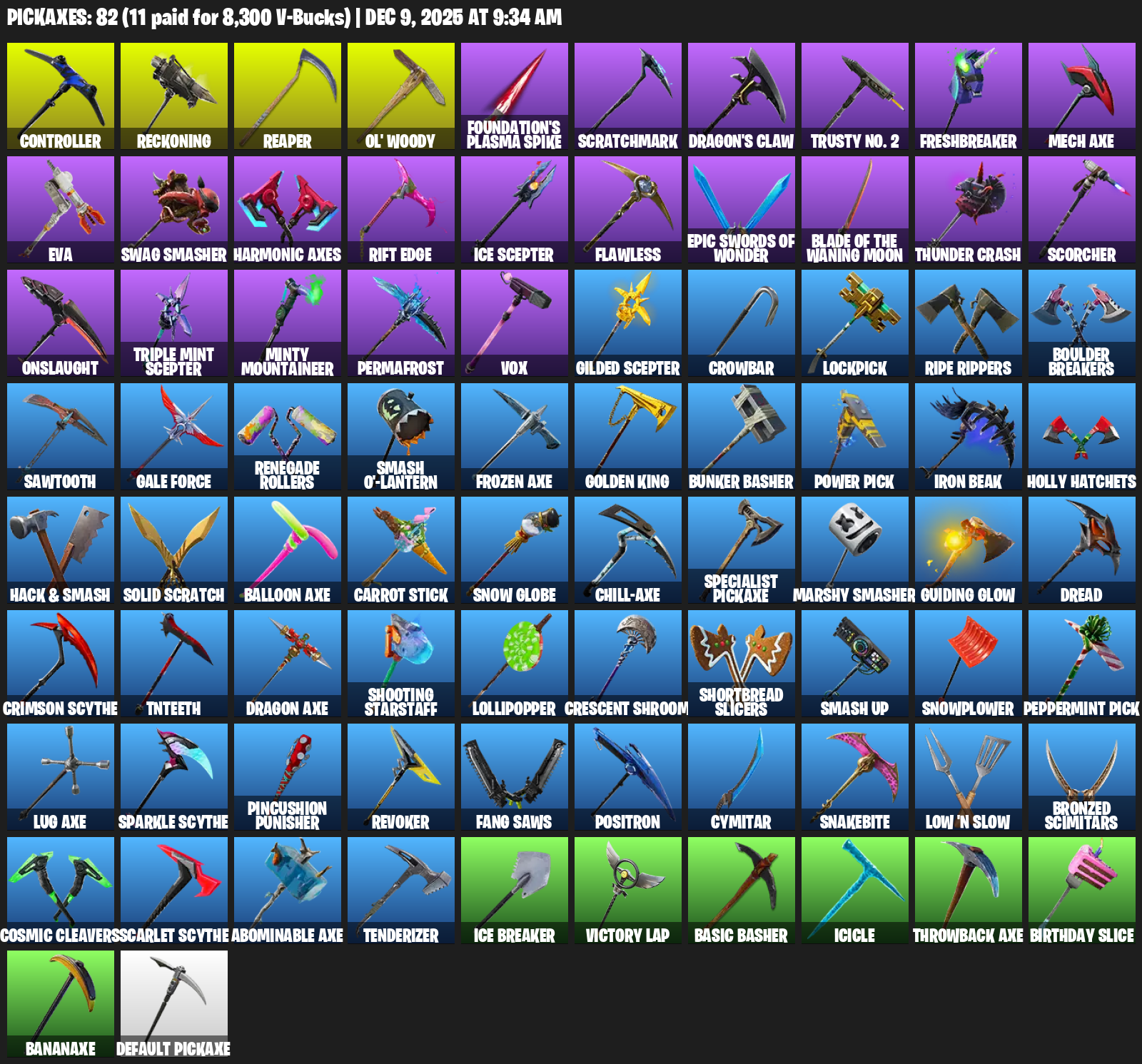 Controller, Reckoning, Ol’ Woody, Foundation’s Plasma Spike, Scratchmark, Dragon’s Claw, Trusty No. 2, Freshbreaker, Mech Axe, EVA, Swag Smasher, Harmonic Axes, Rift Edge, Ice Scepter, Flawless, Thunder Crash, Scorcher