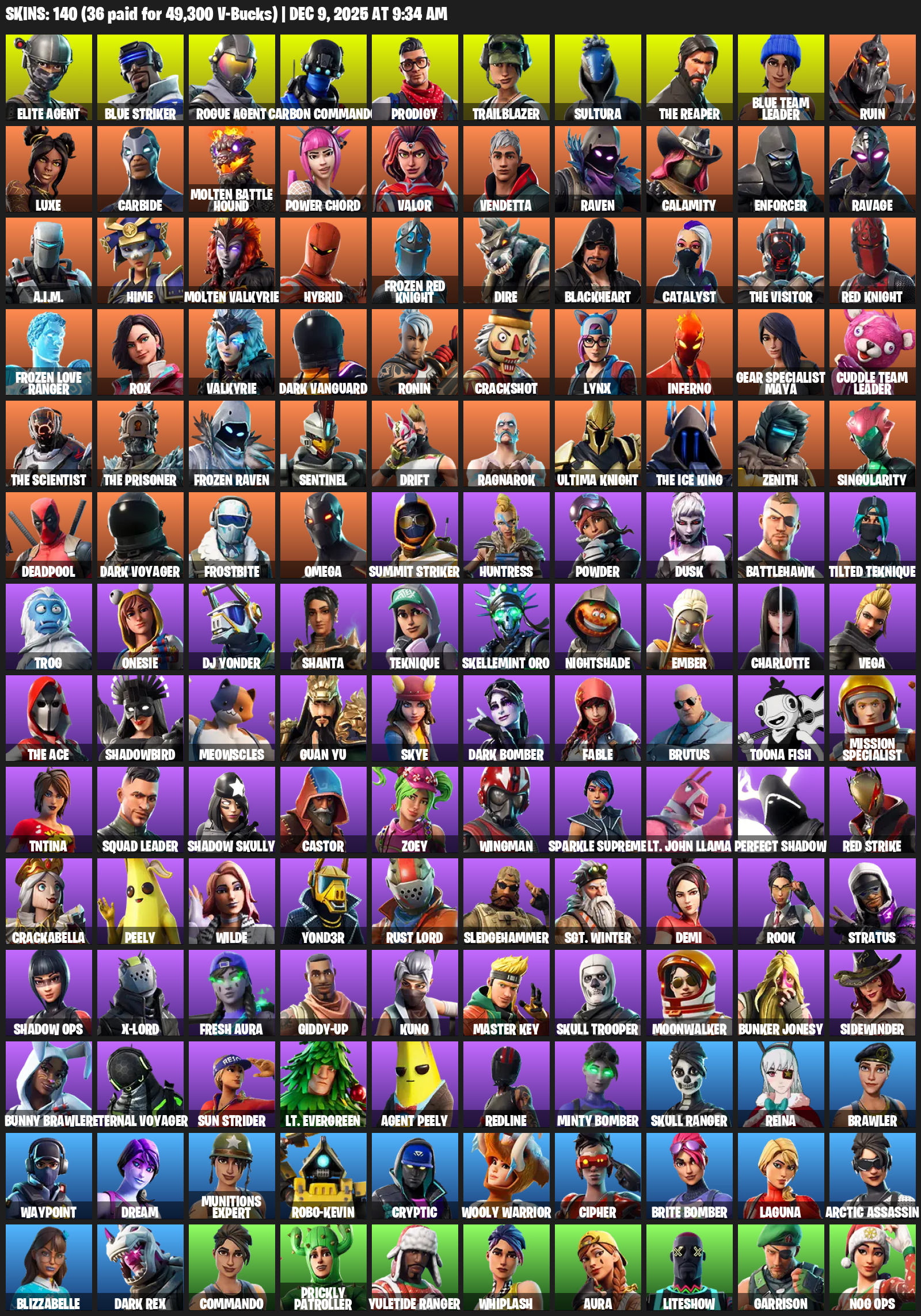 Elite Agent, The Reaper, Gear Specialist Maya, Omega, Blue Striker, Carbon Commando, Prodigy, Trailblazer, Sultura, Ruin, Luxe, Carbide, Molten Battle Hound, Power Chord, Valor, Vendetta, Raven, Calamity