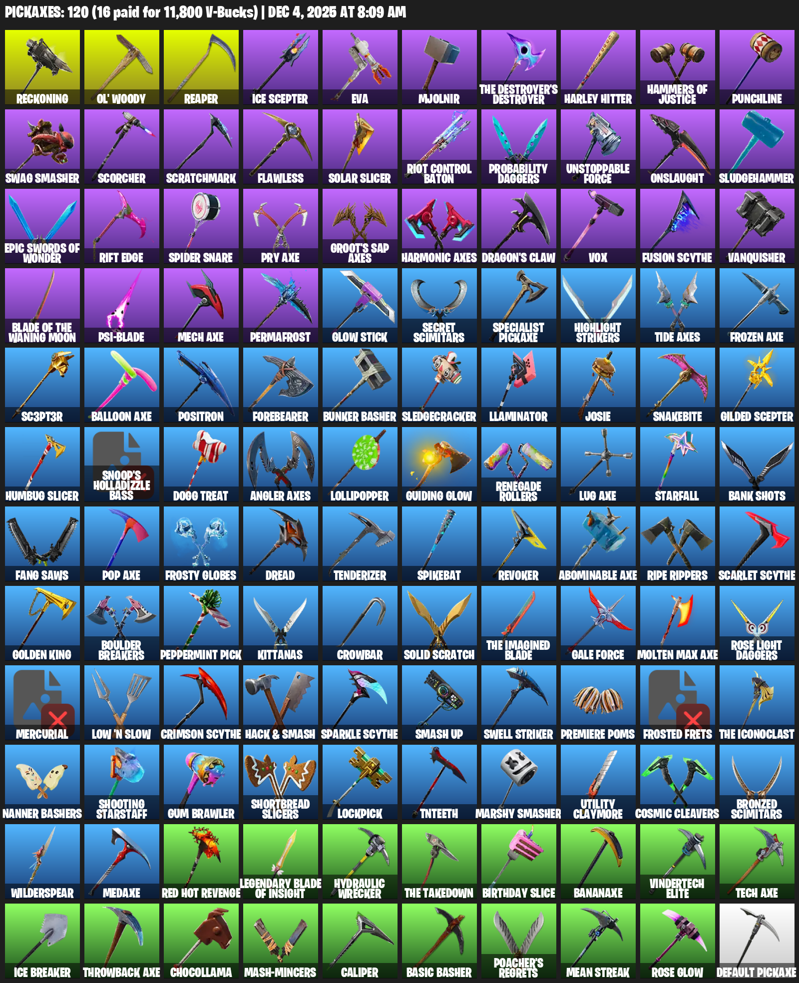 Reckoning, Ol’ Woody, Reaper, Ice Scepter, EVA, Mjolnir, Harley Hitter, Hammers of Justice, Punchline, Swag Smasher, Scorcher, Scratchmark, Flawless, Solar Slicer, Riot Control Baton, Probability Daggers, Unstoppable Force, Onslaught, Sludgehammer
