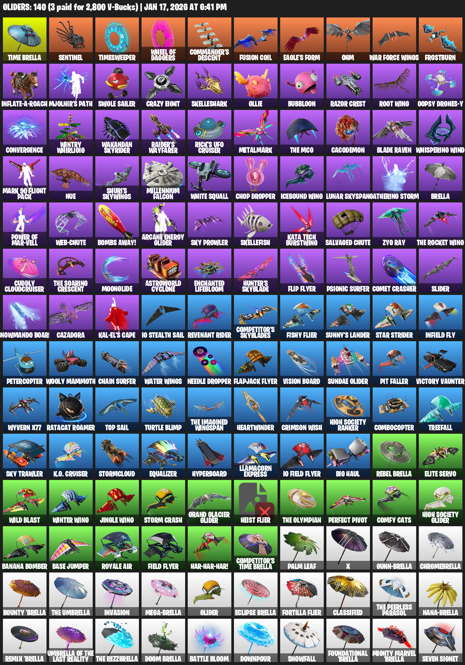 Time Brella, Sentinel, Timesweeper, Commander’s Descent, Eagle’s Form, Ohm, War Force Wings, Frostburn, Mjolnir’s Path, Swole Sailer, Crazy Eight, Skelleshark, Ollie, Bubbloon, Razor Crest, Root Wing, Oopsy Drones-y