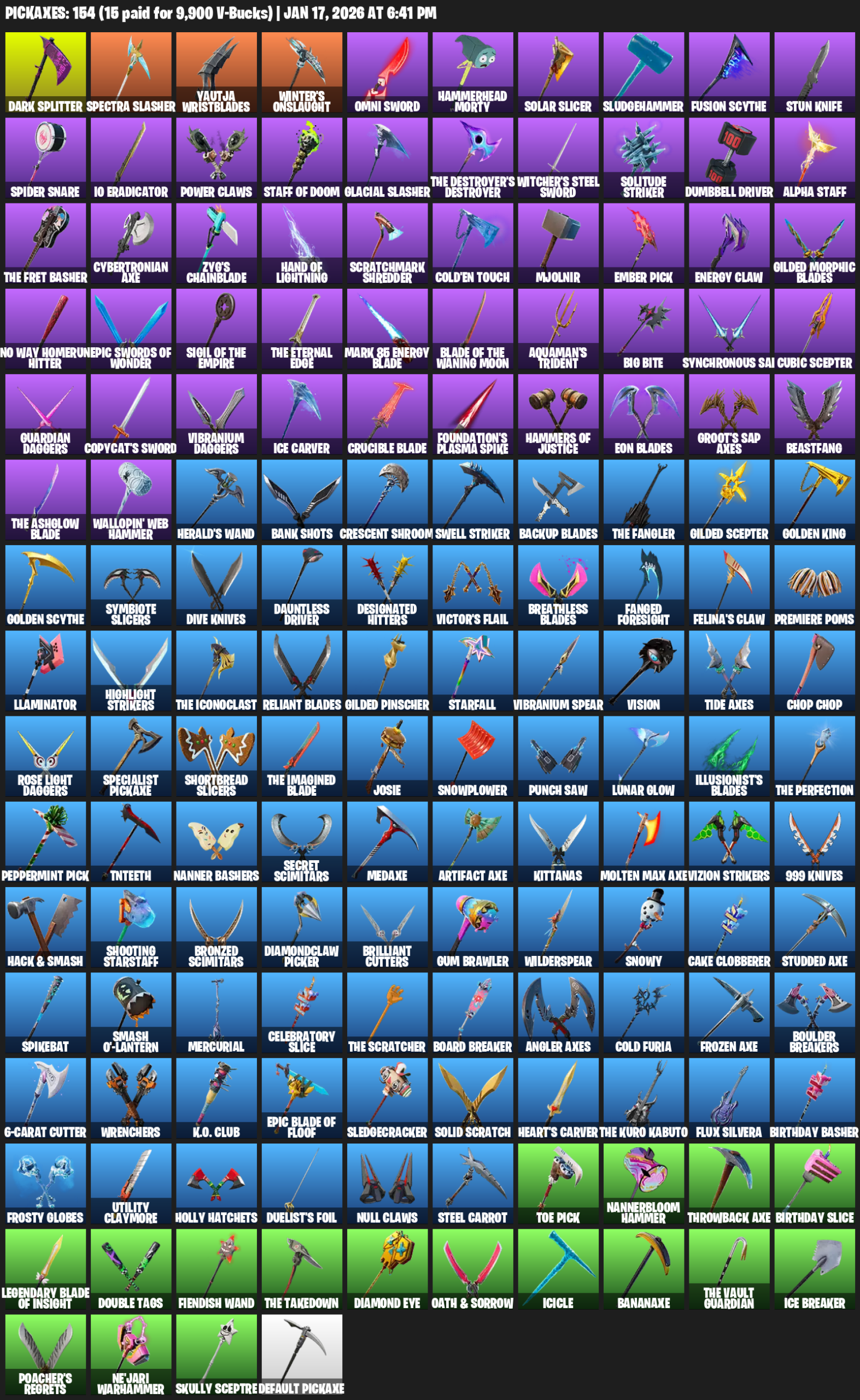 Spectra Slasher, Yautja Wristblades, Winter’s Onslaught, Omni Sword, Hammerhead Morty, Solar Slicer, Sludgehammer, Stun Knife, Spider Snare, IO Eradicator, Power Claws, Staff of Doom, Solitude Striker, Dumbbell Driver
