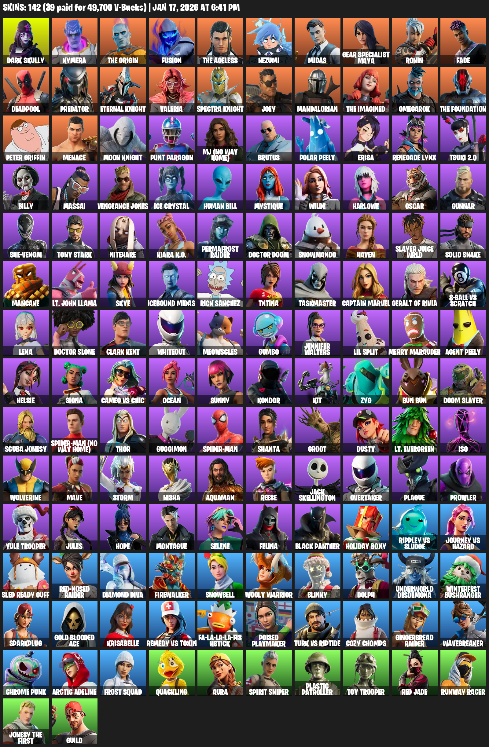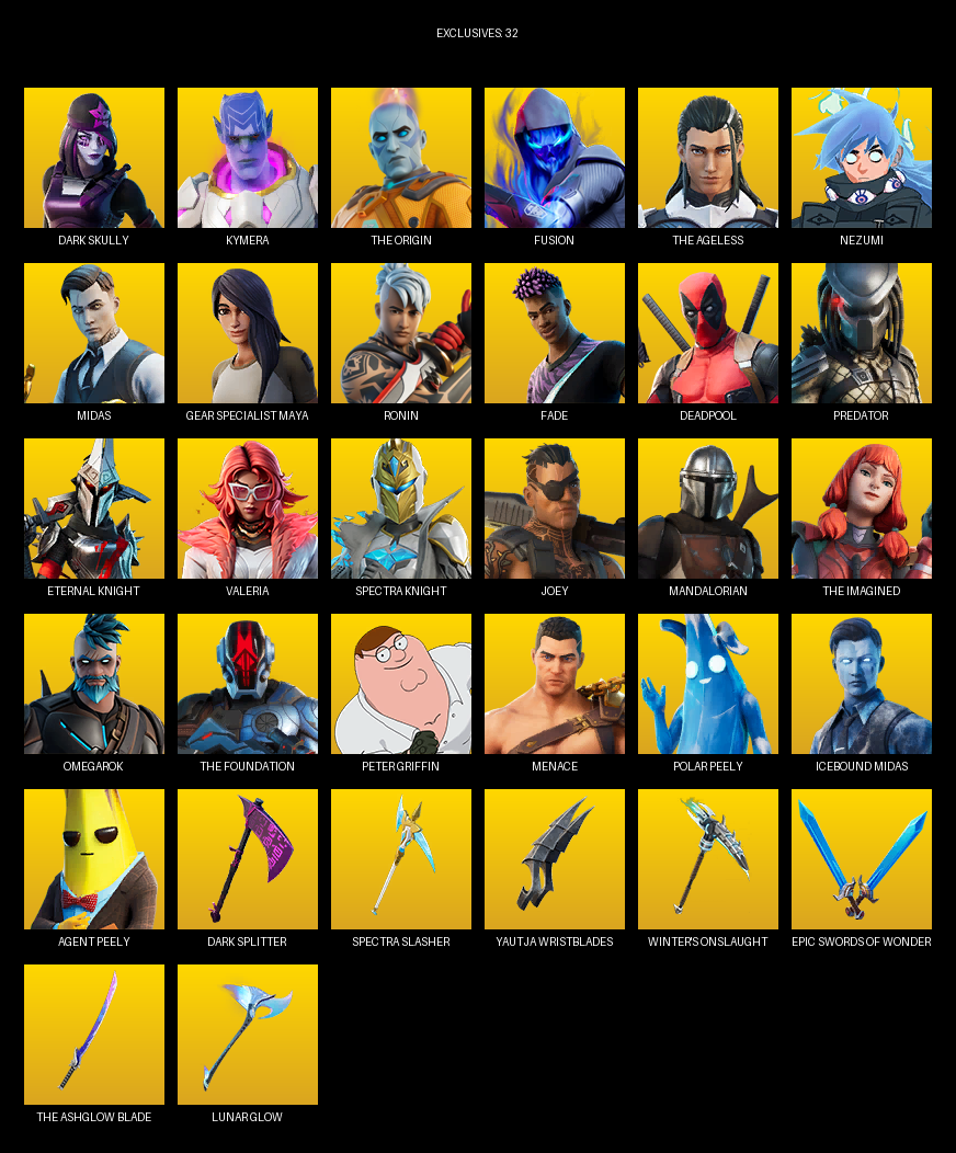 Gear Specialist Maya, Dark Skully, Kymera, The Origin, Fusion, Nezumi, Midas, Ronin, Fade, Deadpool, Predator, Eternal Knight, Valeria, Joey, Mandalorian, Omegarok