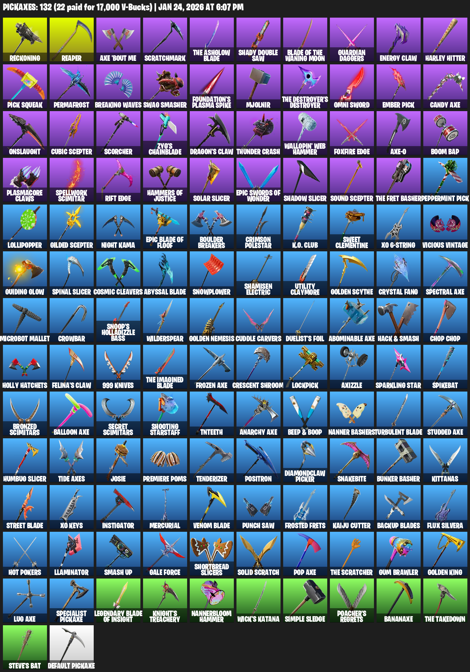 Reckoning, Reaper, Axe ‘Bout Me, Scratchmark, Shady Double Saw, Guardian Daggers, Energy Claw, Harley Hitter, Pick Squeak, Permafrost, Breaking Waves, Swag Smasher, Foundation’s Plasma Spike, Mjolnir, Omni Sword