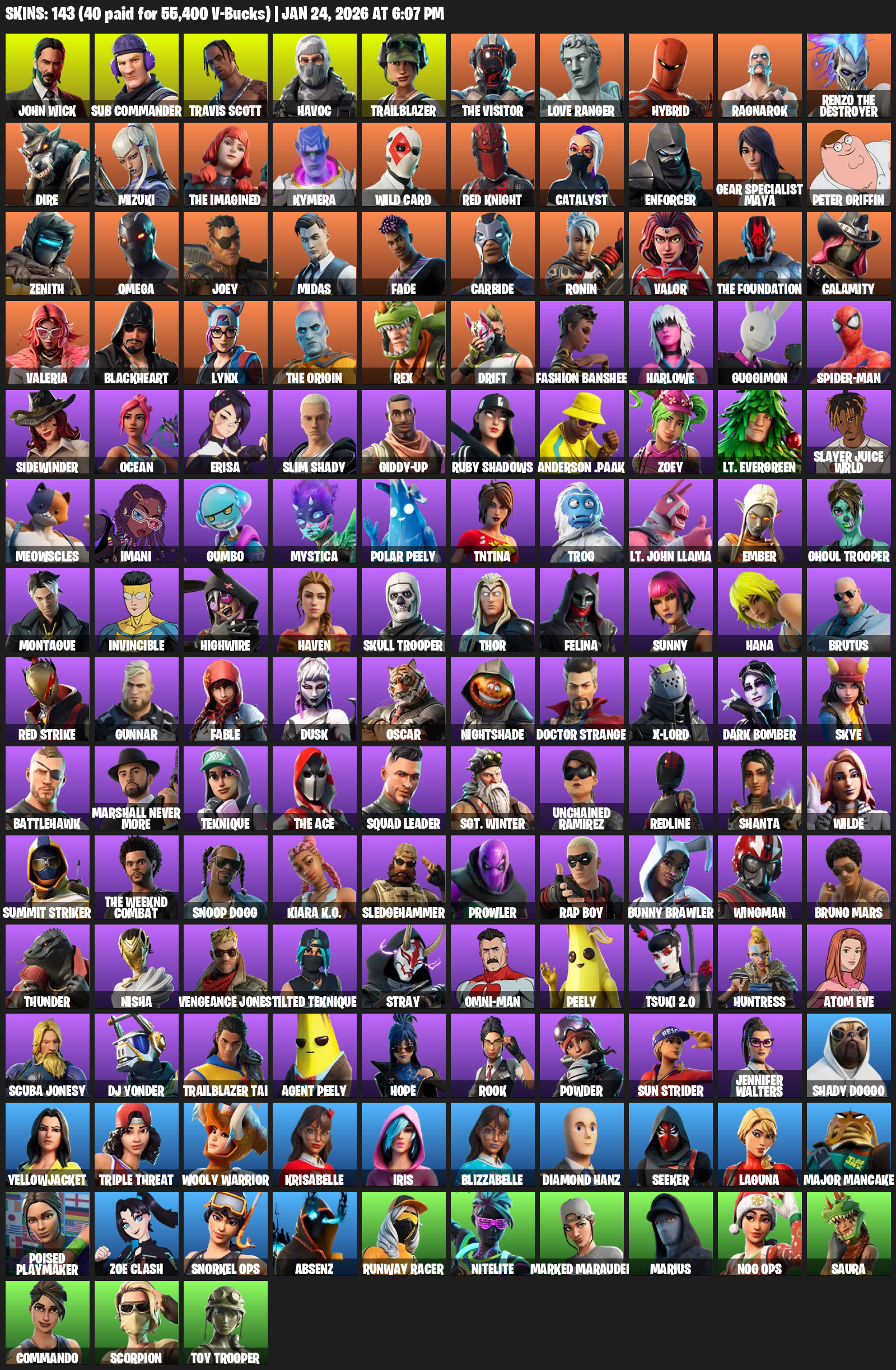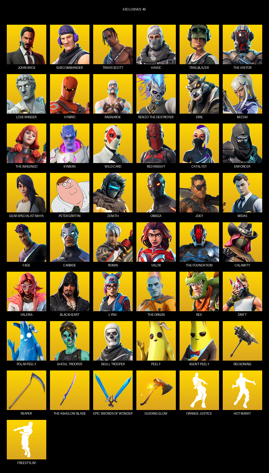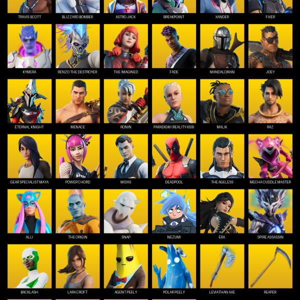 Travis Scott, Gear Specialist Maya, Omega, John Wick, Sub Commander, Havoc, Trailblazer, The Visitor, Love Ranger, Hybrid, Ragnarok, Dire, Mizuki, Kymera, Wild Card, Red Knight, Catalyst, Enforcer