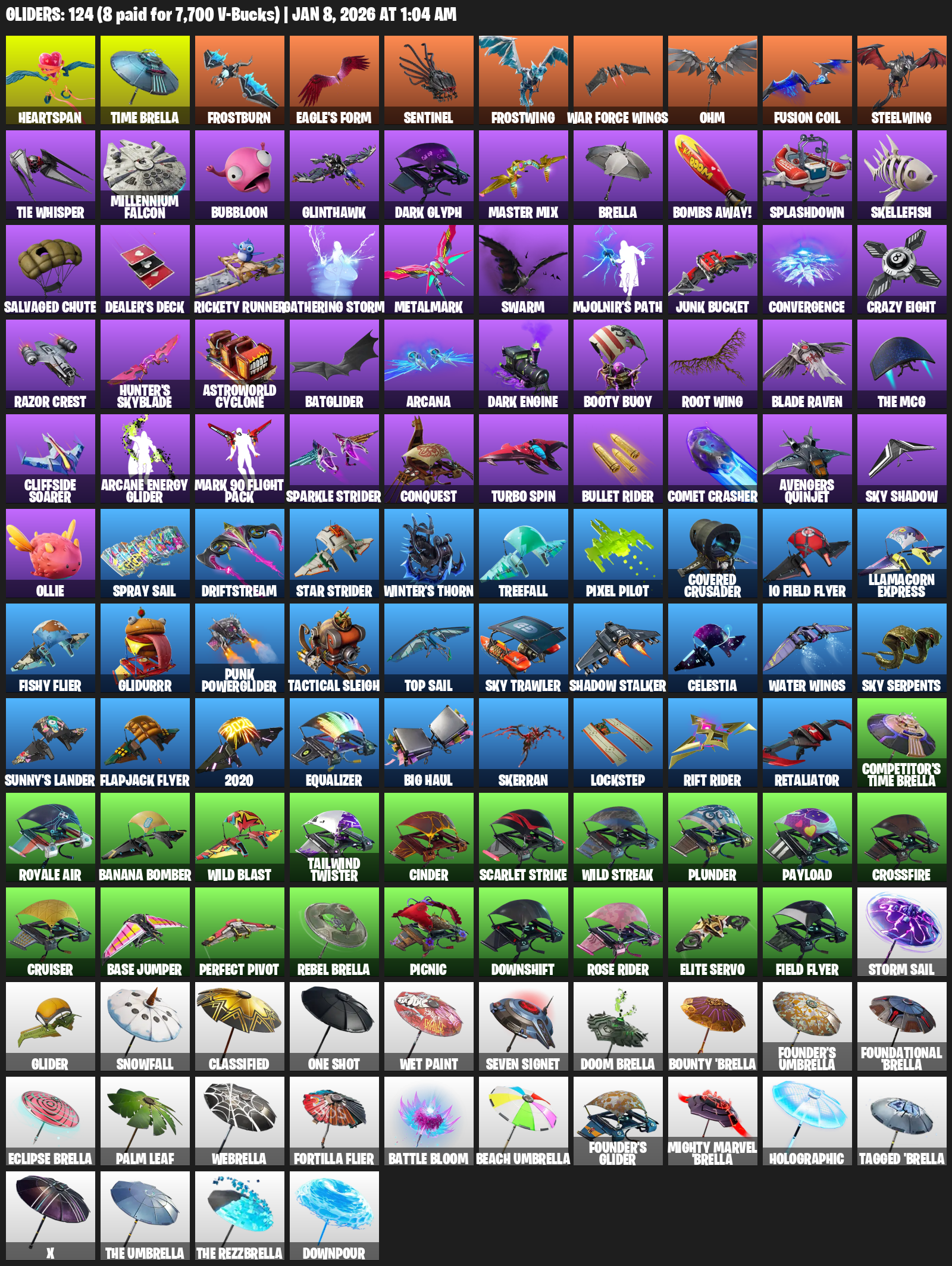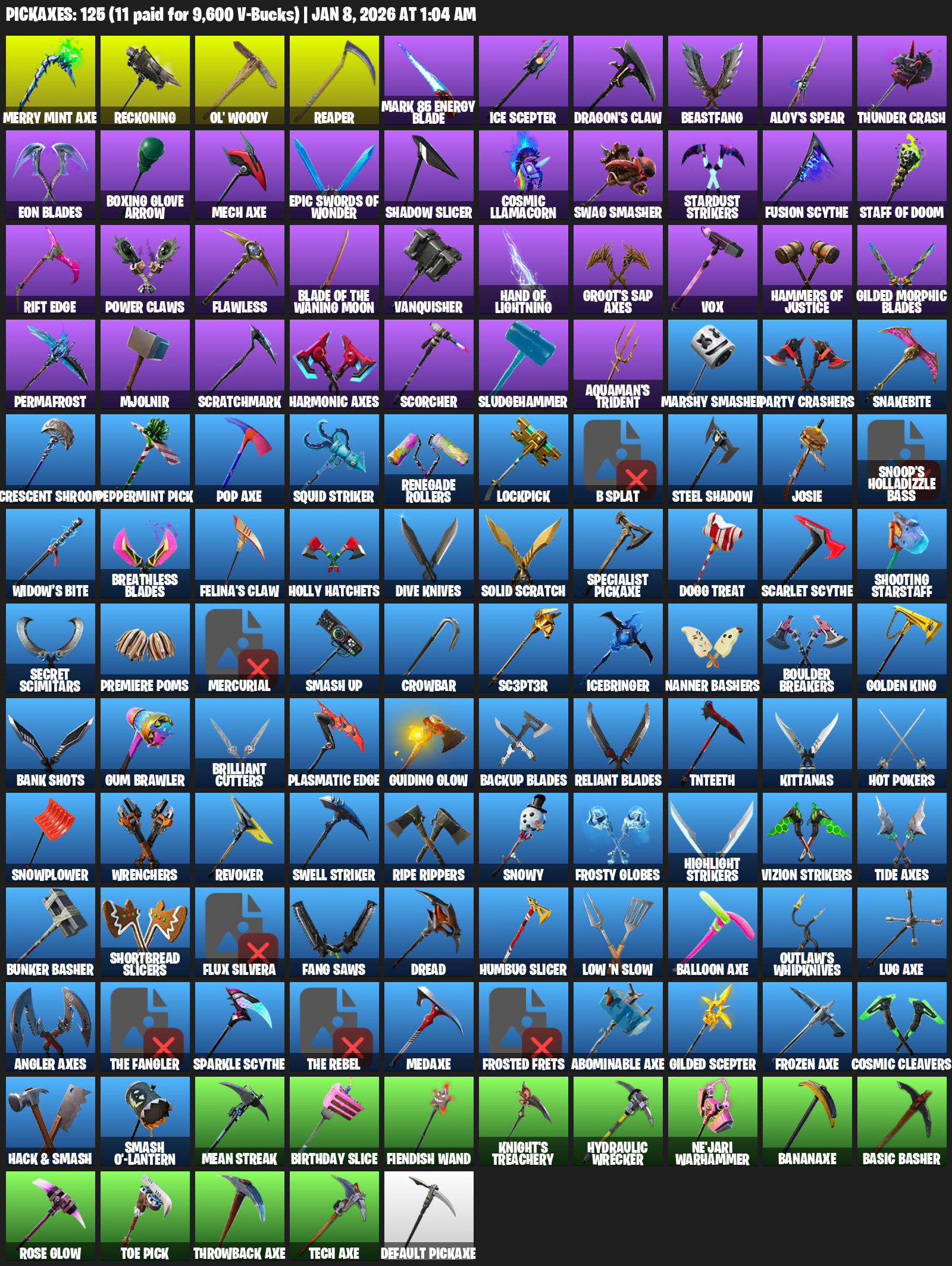 Merry Mint Axe, Reckoning, Ol’ Woody, Reaper, Mark 85 Energy Blade, Dragon’s Claw, Beastfang, Aloy’s Spear, Thunder Crash, Eon Blades, Boxing Glove Arrow, Shadow Slicer, Cosmic Llamacorn, Swag Smasher, Stardust Strikers, Staff of Doom