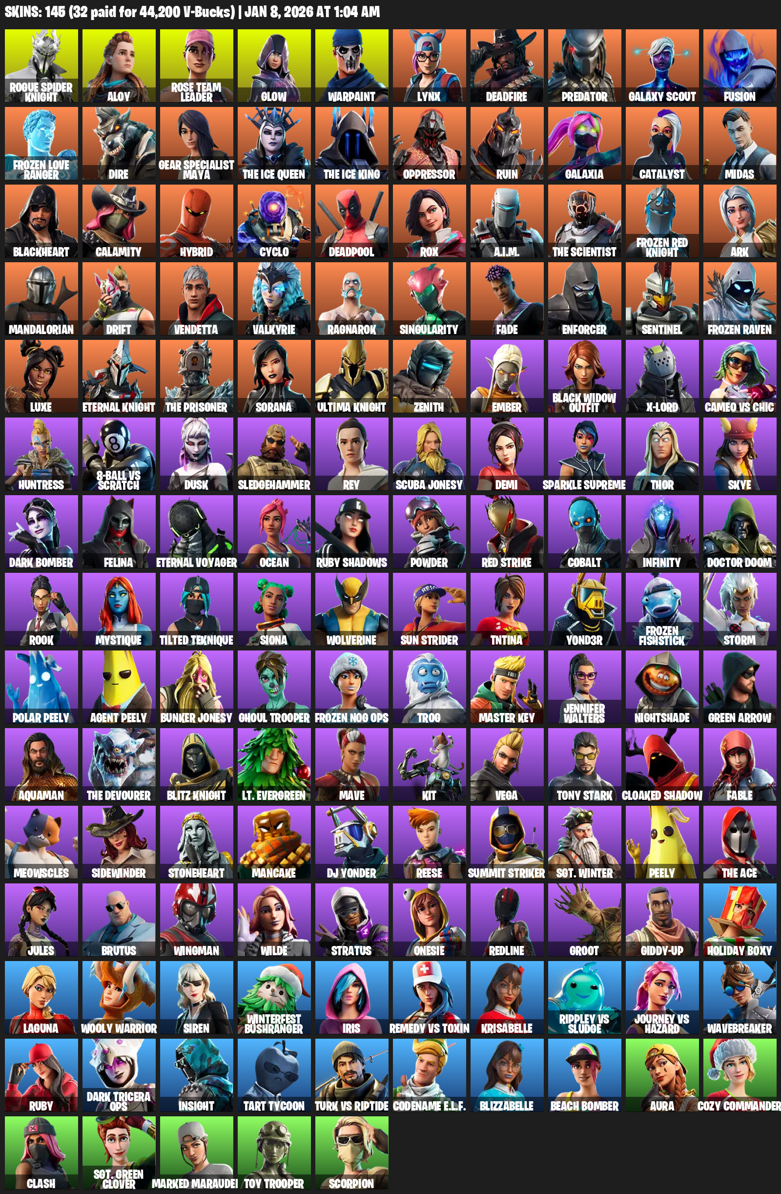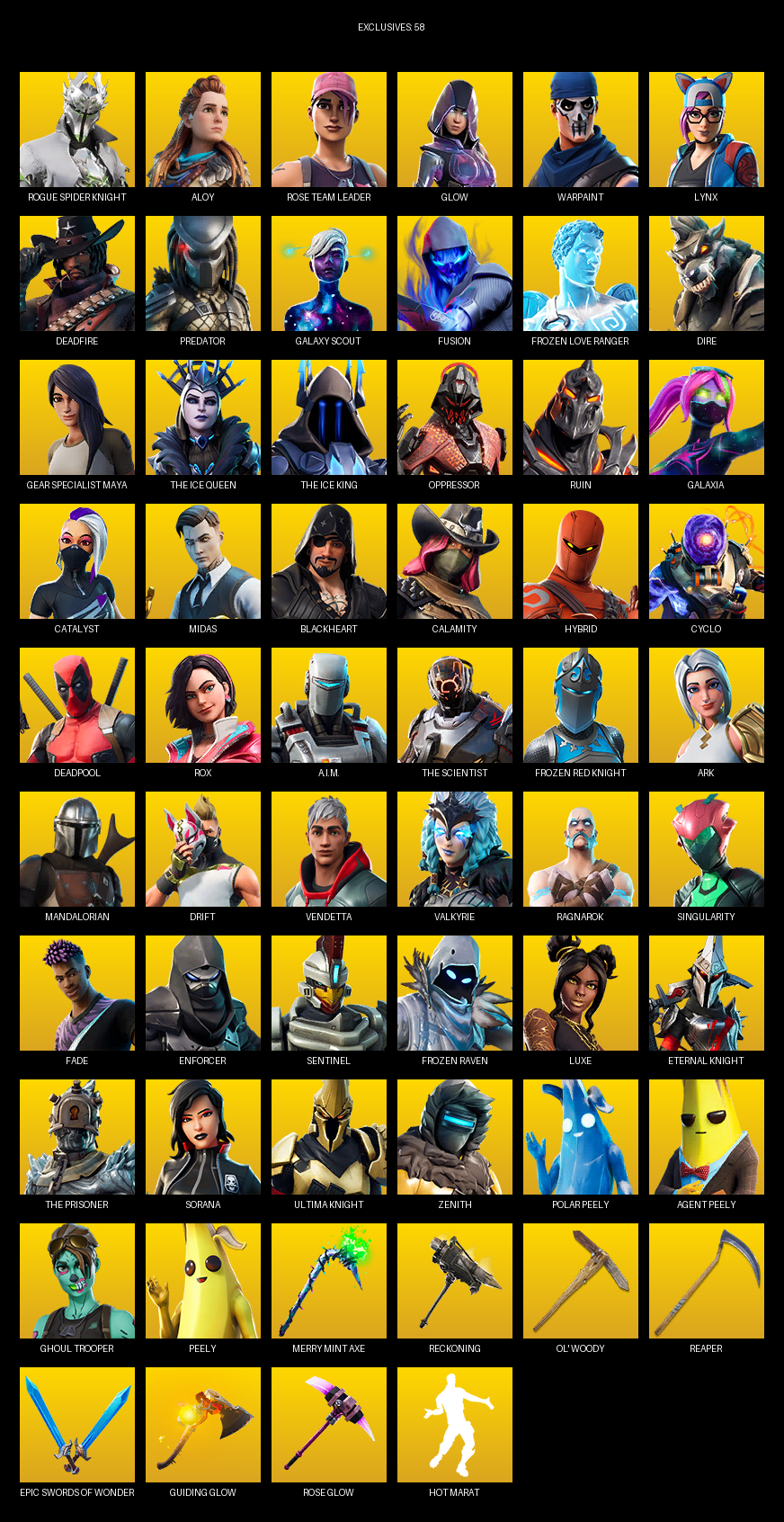 Gear Specialist Maya, Rogue Spider Knight, Aloy, Rose Team Leader, Glow, Warpaint, Lynx, Deadfire, Predator, Galaxy Scout, Fusion, Frozen Love Ranger, Dire, The Ice Queen, Oppressor, Ruin, Galaxia, Catalyst, Midas